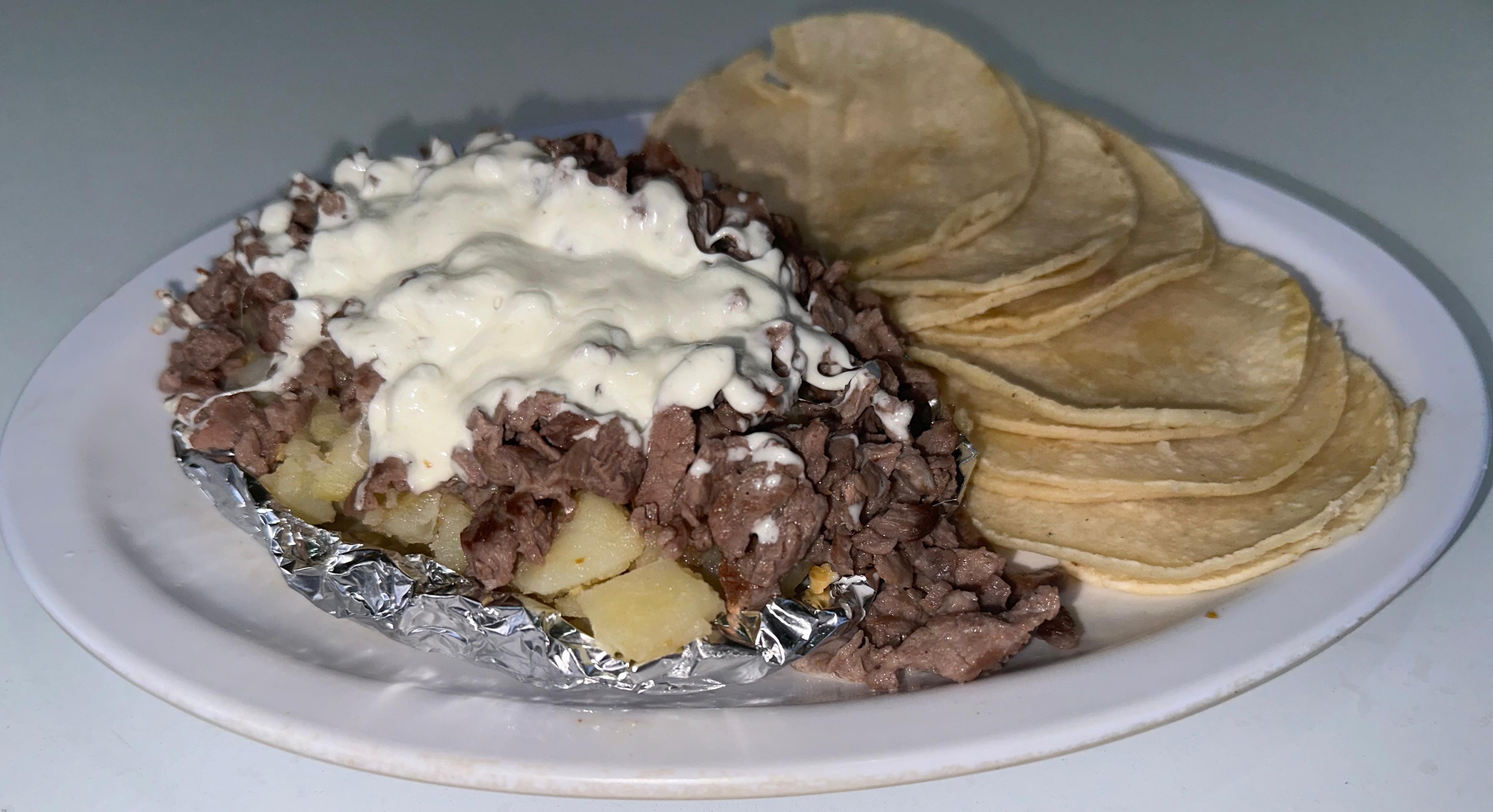 Tortilla de harina y bistec.