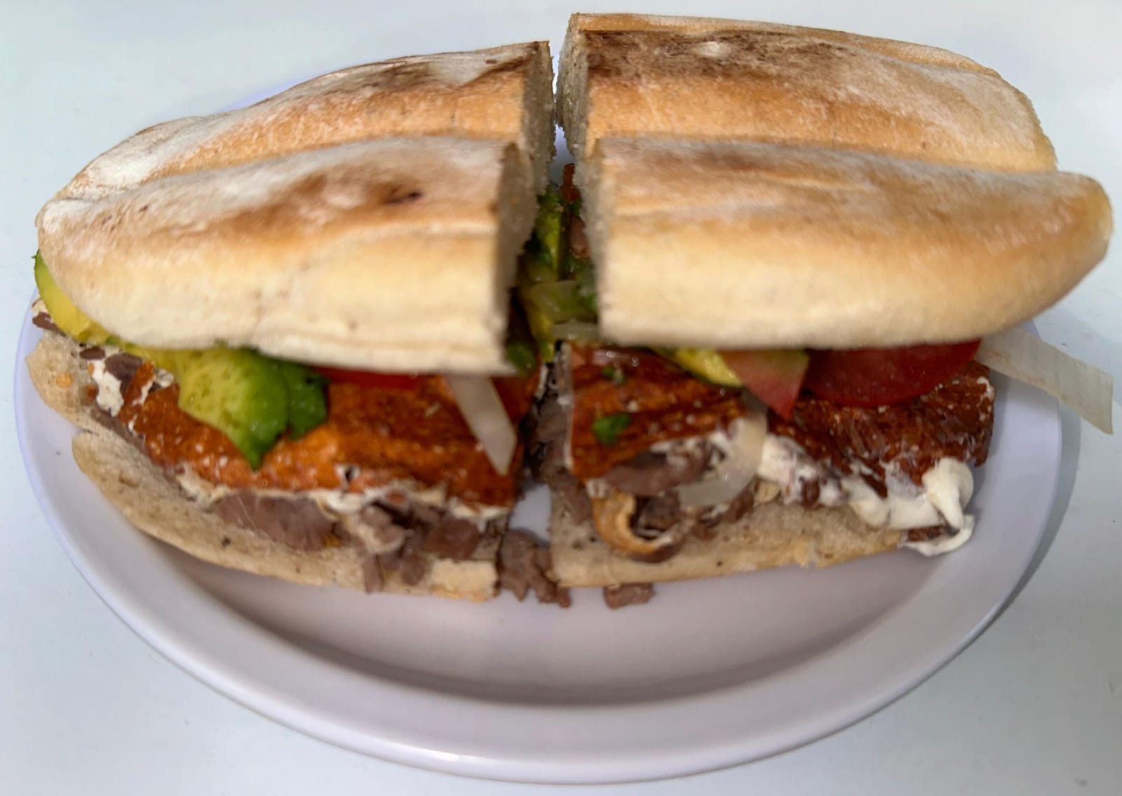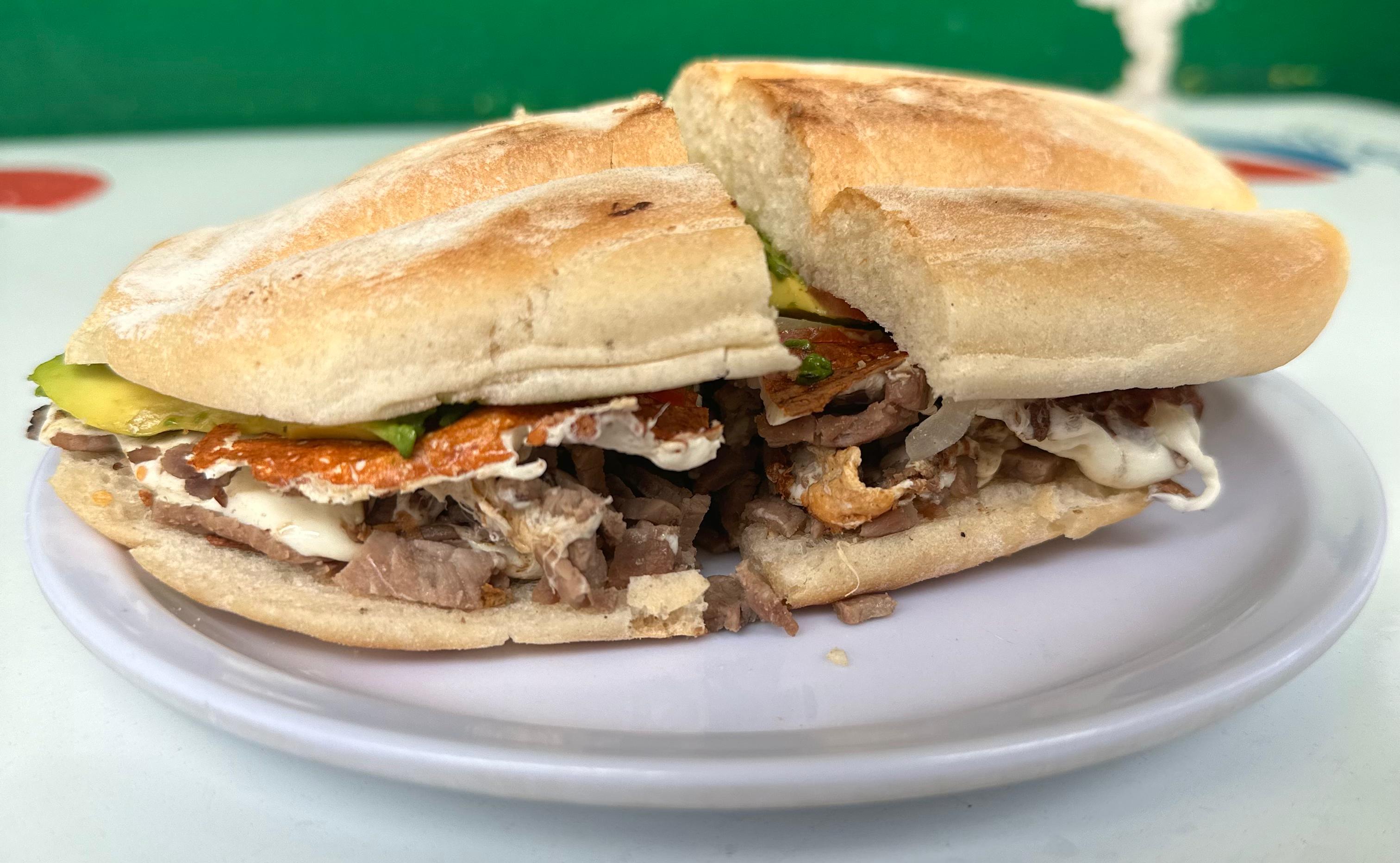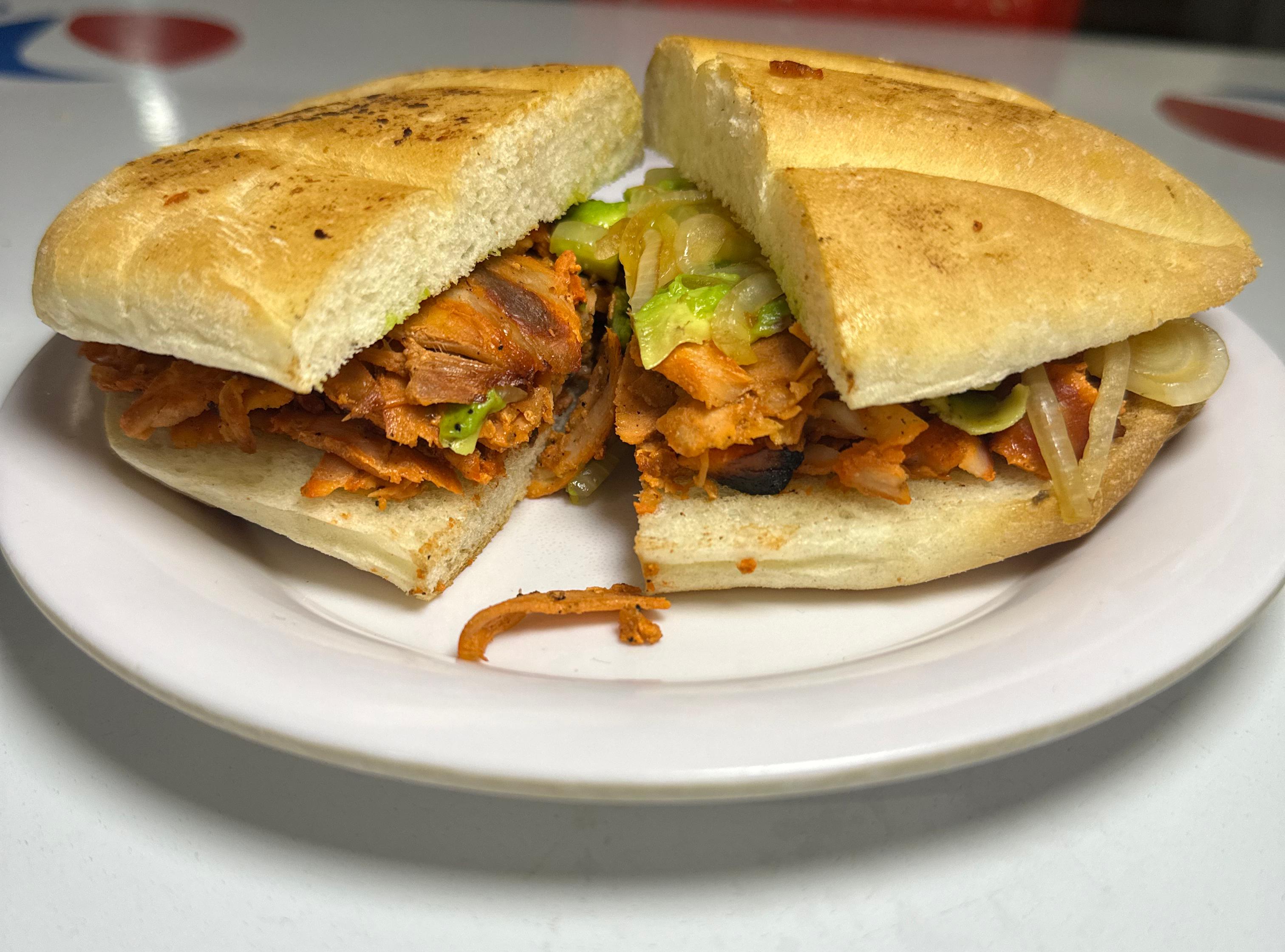 Pastor, milanesa, jamón, frijol, cebolla Jitomate y aguacate. Queso