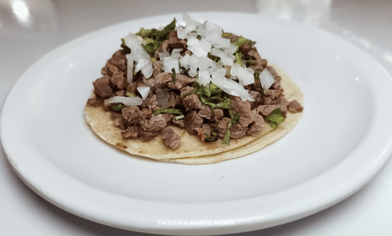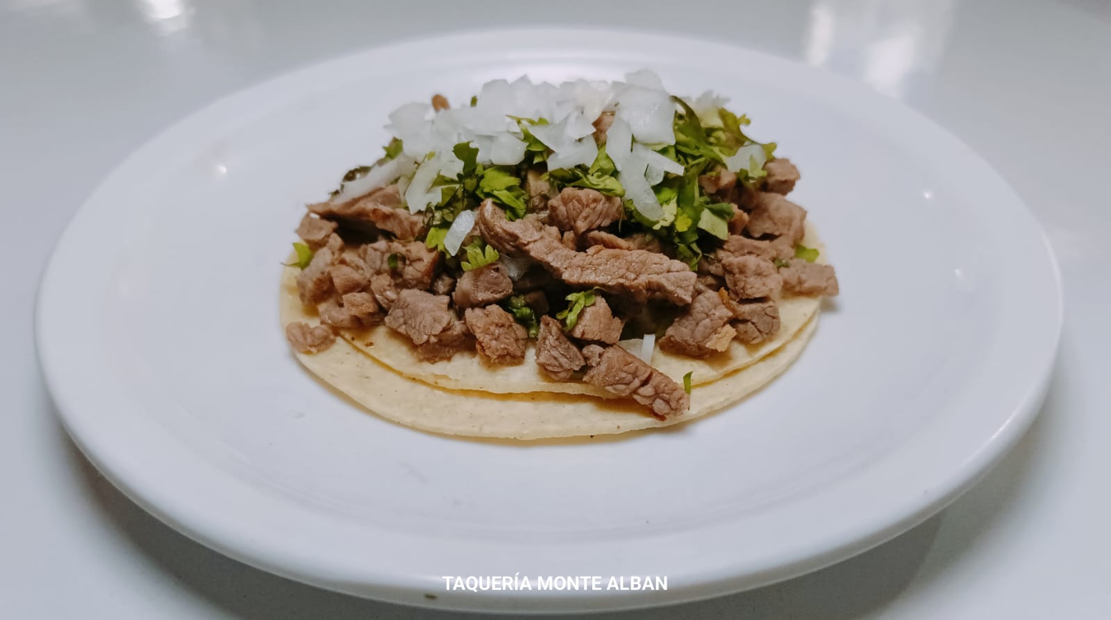 3 tortillas de harina bistec, cebolla, cilantro y queso.