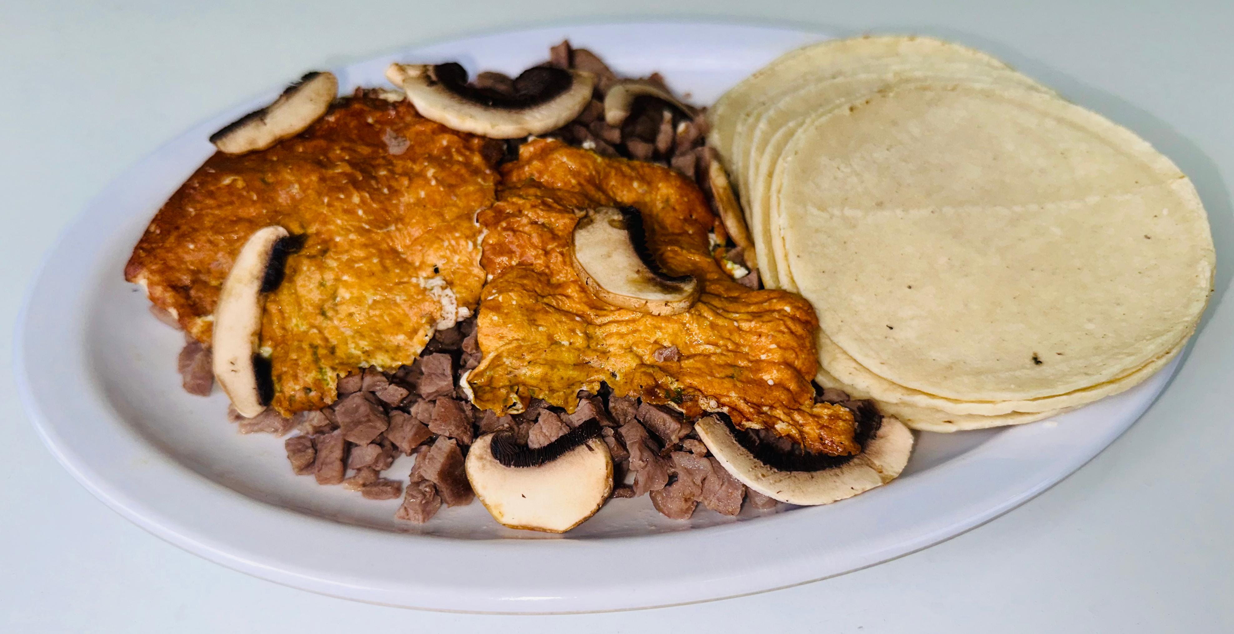 Una porción de carne con champiñones para 5 tacos. Y queso