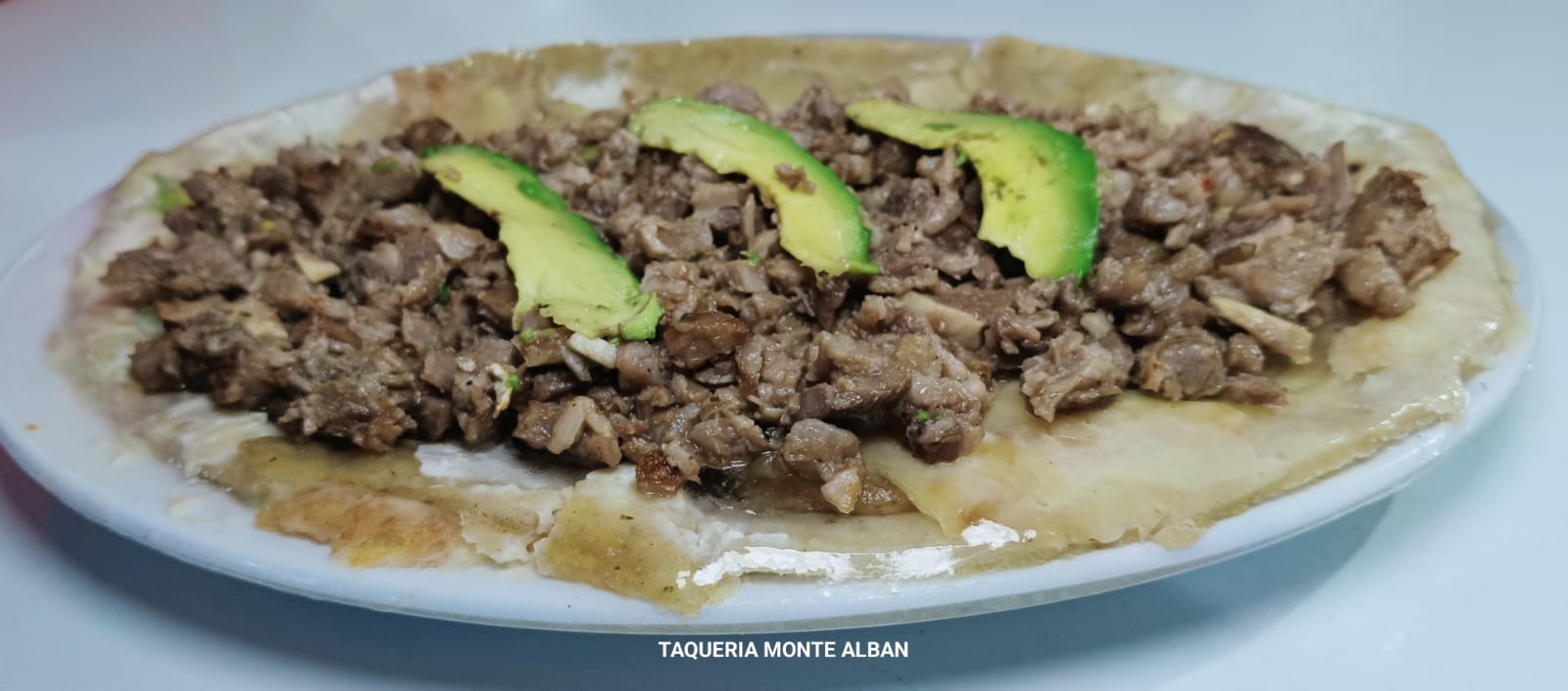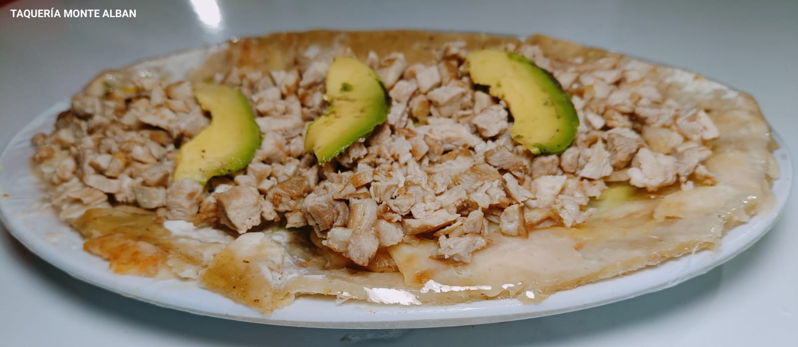 Tortilla de harina aguacate, cebolla, Jitomate y queso.