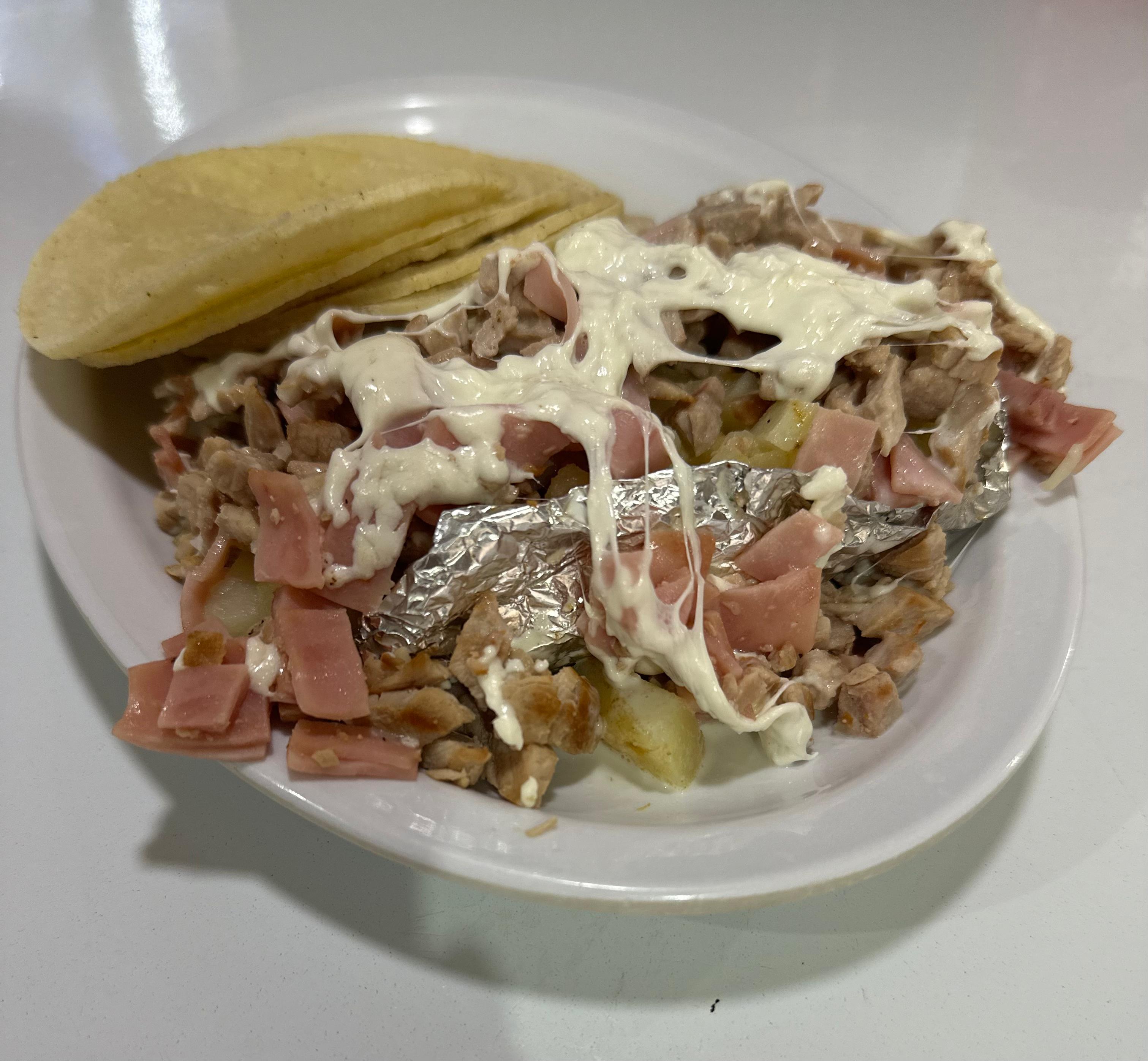 pastor, piña, jamón, frijol, cebolla Jitomate aguacate.queso