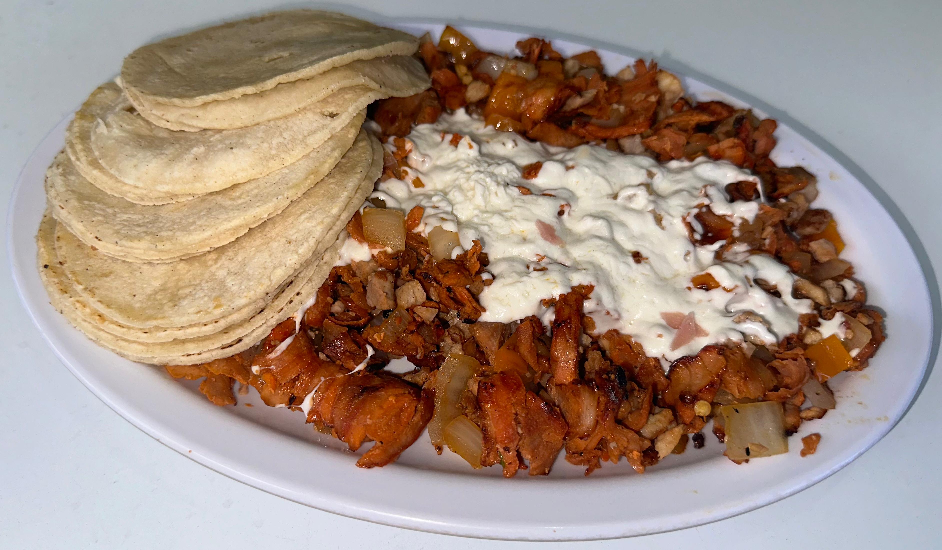 chorizo , frijol, cebolla, jitomate y aguacate.