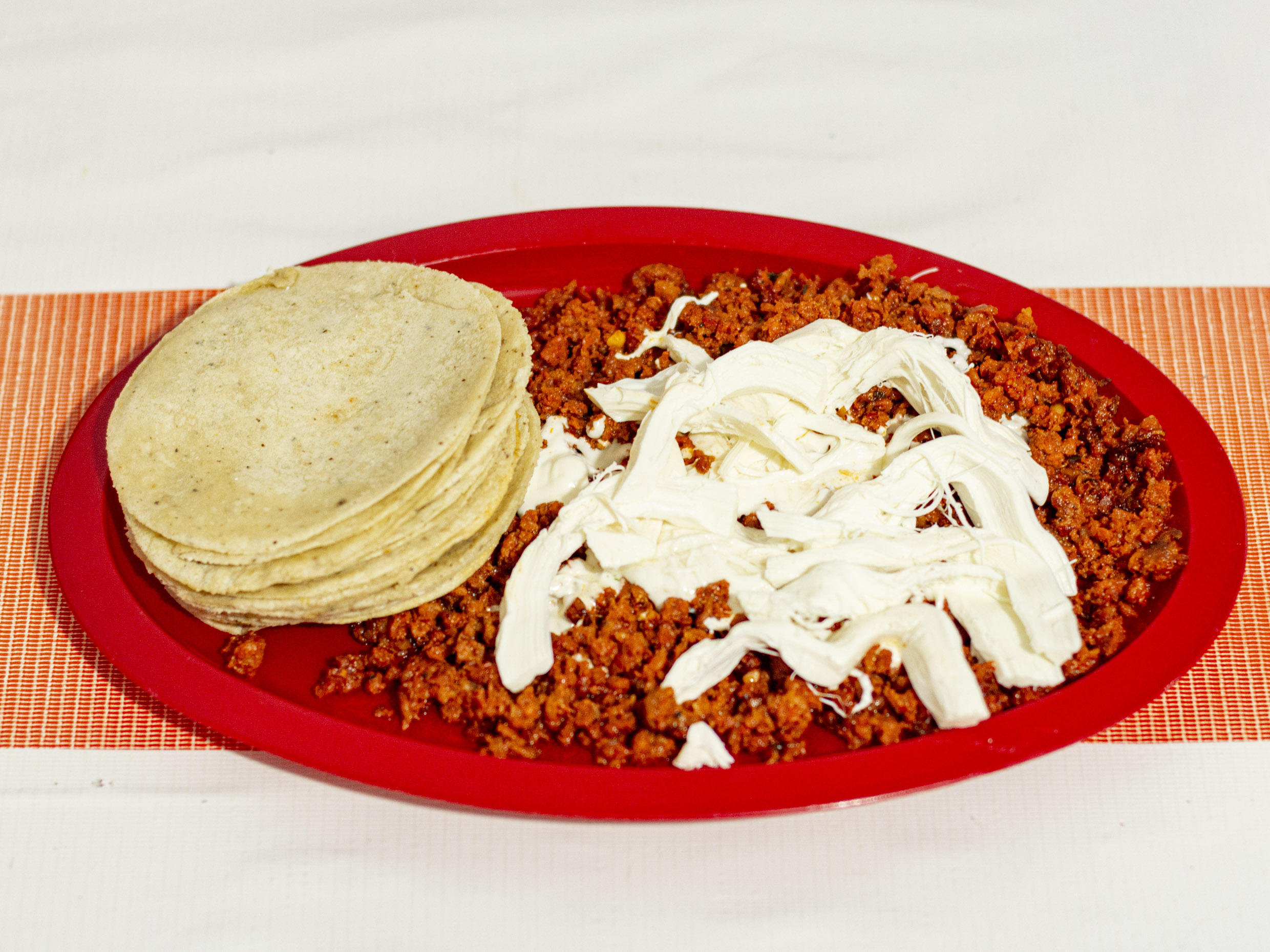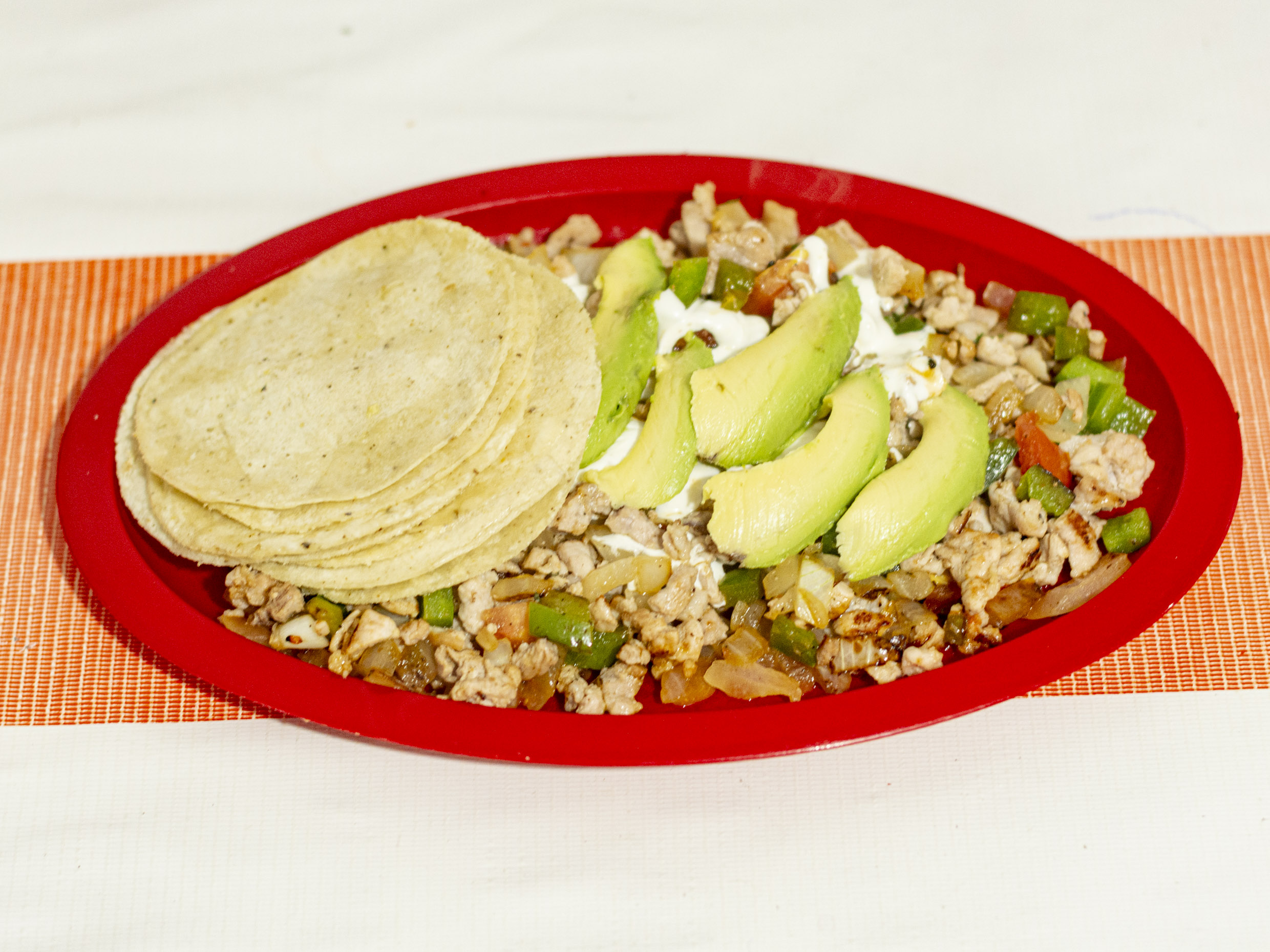 Chuleta, nopal, cebolla, jitomate, chile morrón, aguacate y queso.