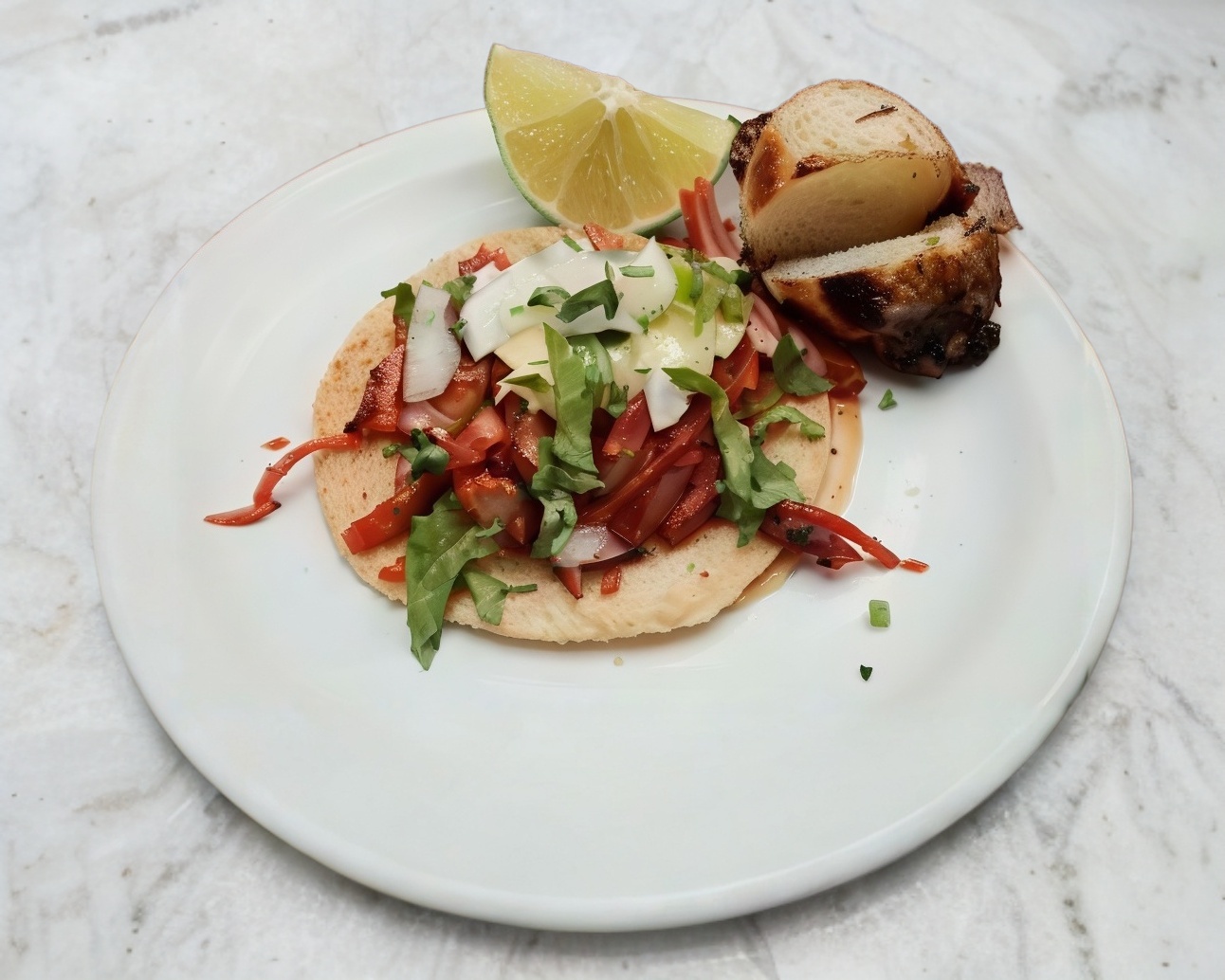Taco servido de bistec, con queso gratinado, acompañado con cebolla asada y limones, con salsa a elección y refresco.