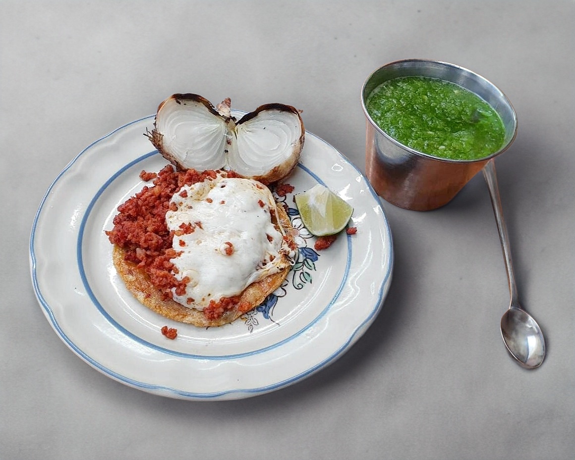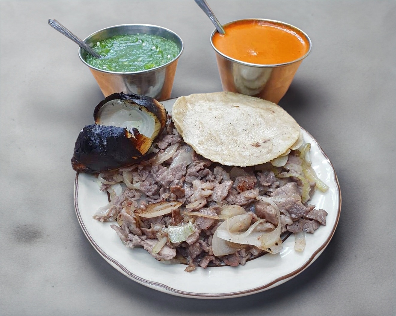 Bistec, pastor, tocino, queso Oaxaca, chile poblano y cebolla.