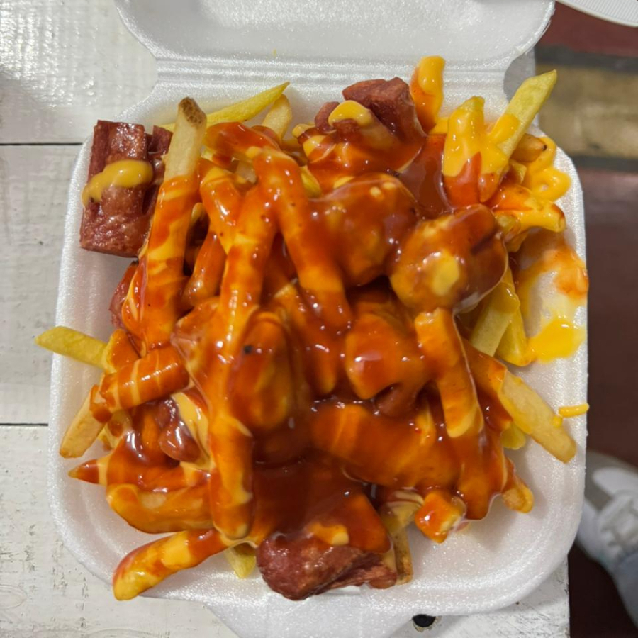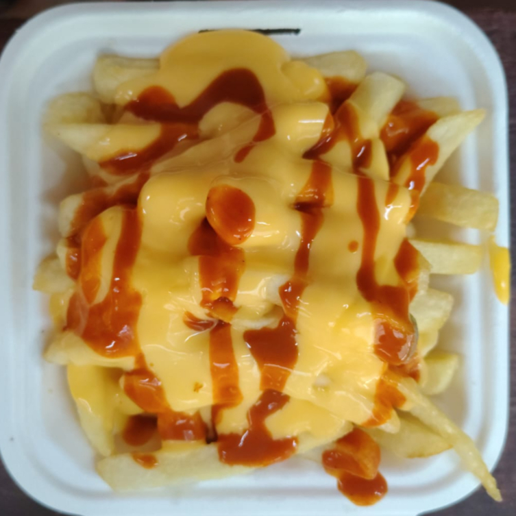 250g de papas fritas acompañadas de queso tipo cheddar, salsa de tomate y salsa t