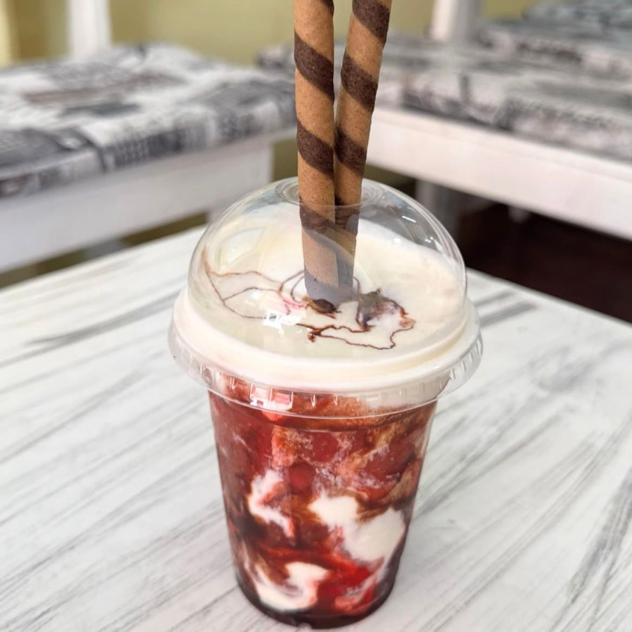 Fresas 100% naturales, crema de la casa, chocolate liquido, crema batida y chochitos de chocolate