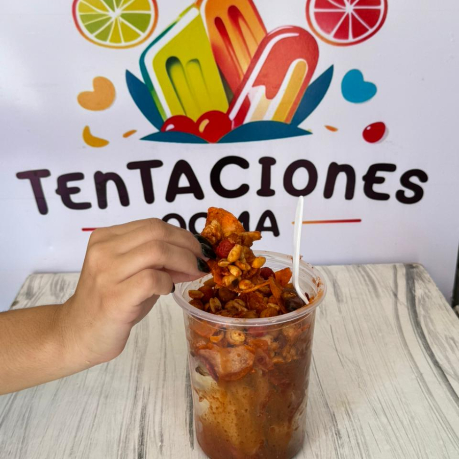 Bolsa de papas "Doritos" preparados con zanahoria, jícama, pepino, cacahuate japonés o botana surtida, Salsas negras, chamoy, Miguelito y salsa