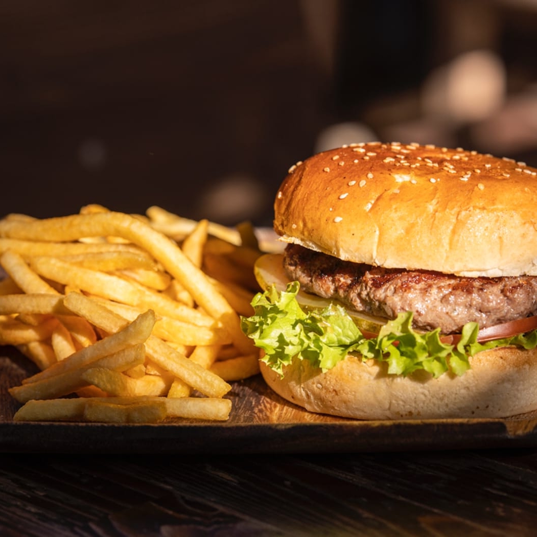 Doble carne de res, queso, tocino, cebolla caramelizada y salsa BBQ.