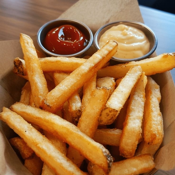 Papas fritas, queso, tocino y cebolla caramelizada.