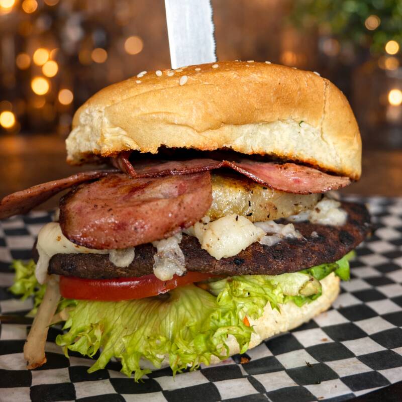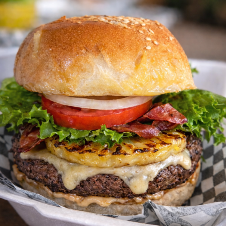 Carne de res, tocino, piña asada, queso mozzarella fundido, lechuga fresca, jitomate y nuestro aderezo especial.