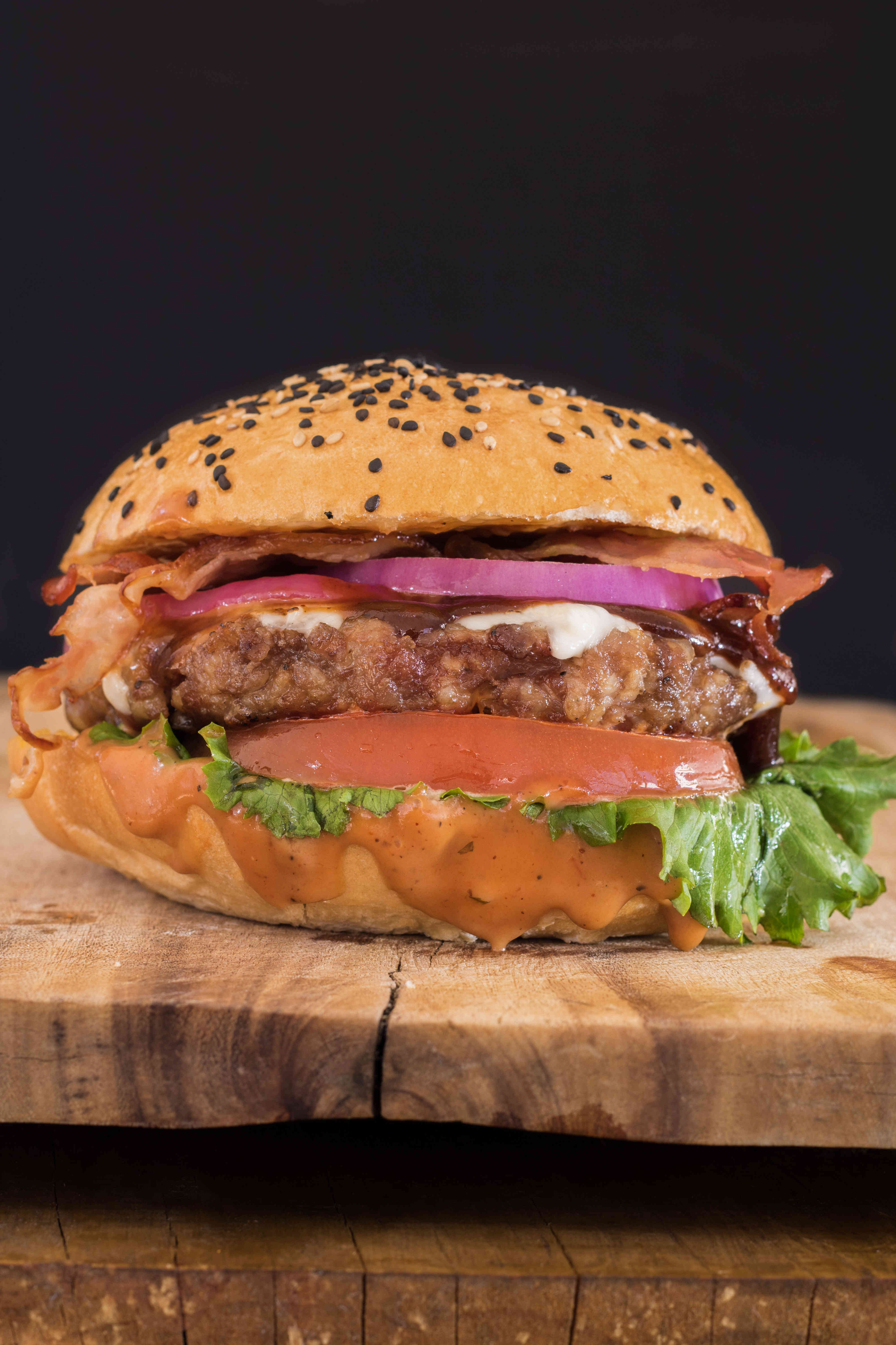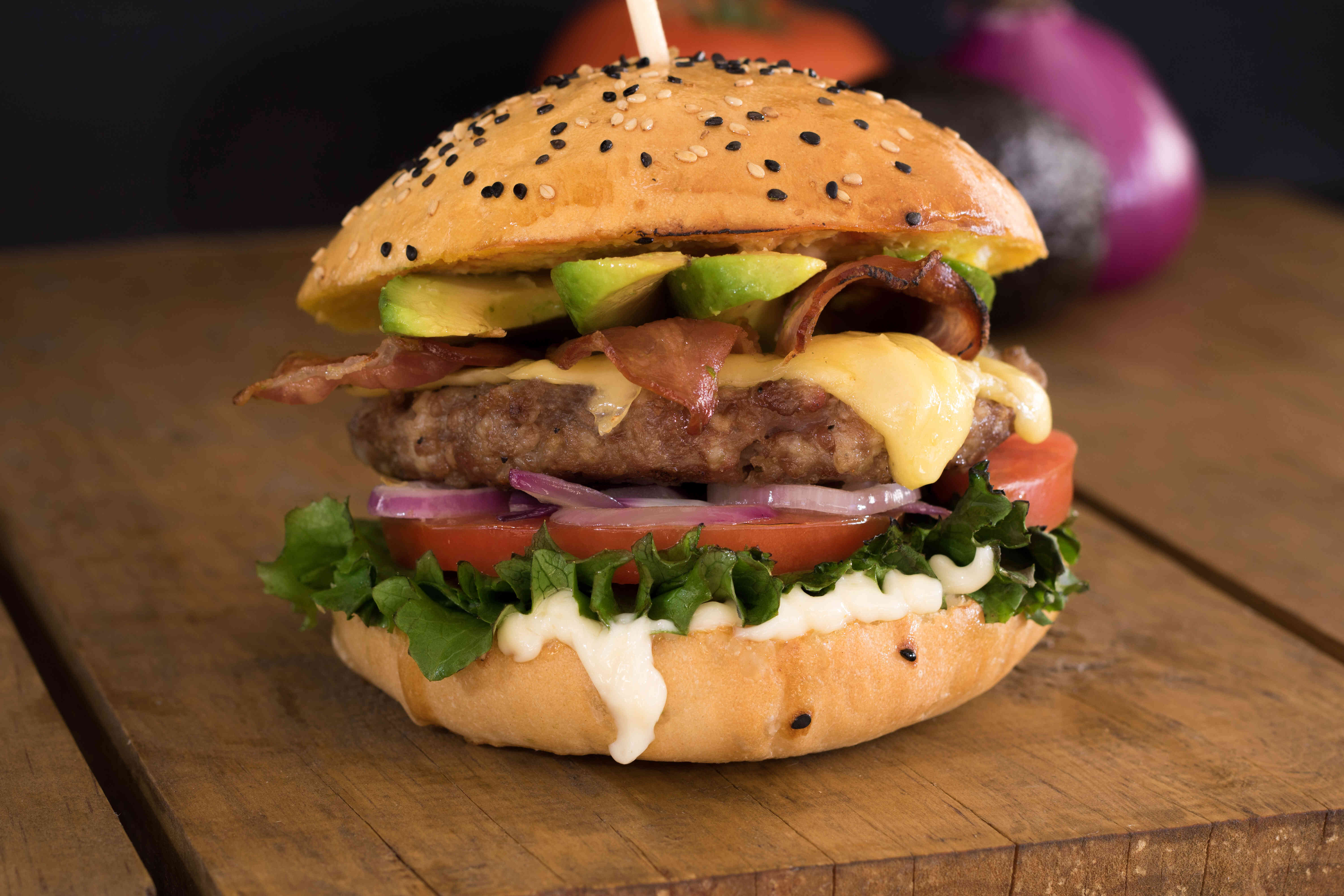 Hamburguesa de pan artesanal y carne casera de 150g. Acompañada con una cama de lechuga, aguacate, rebanadas de jitomate,tocino, queso manchego fundido, anillos de cebolla y mayonesa