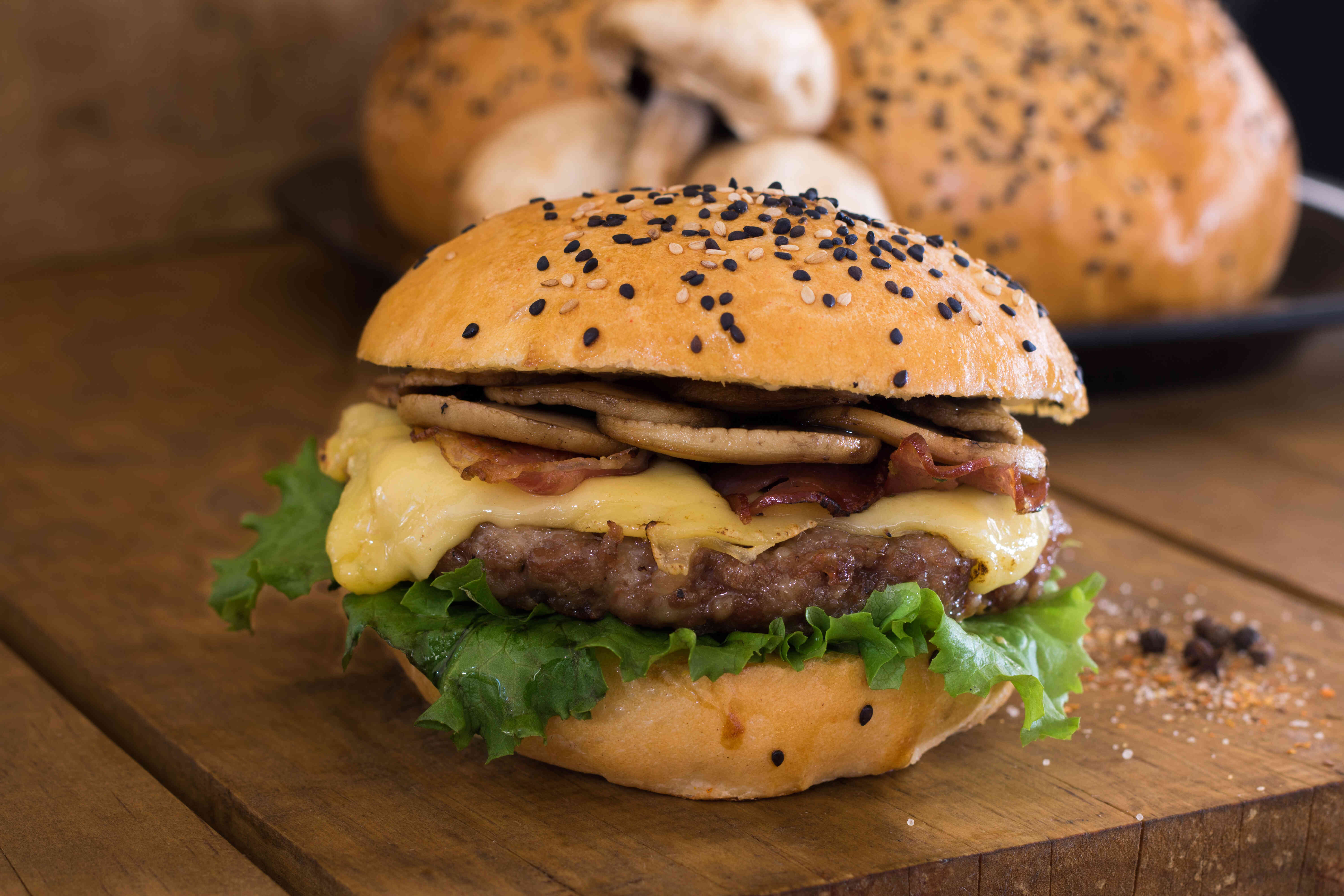 Hamburguesa de pan artesanal y carne 150g. Acompañada con champiñones, queso manchego y menonita , tocino, una cama de lechuga ,mayonesa