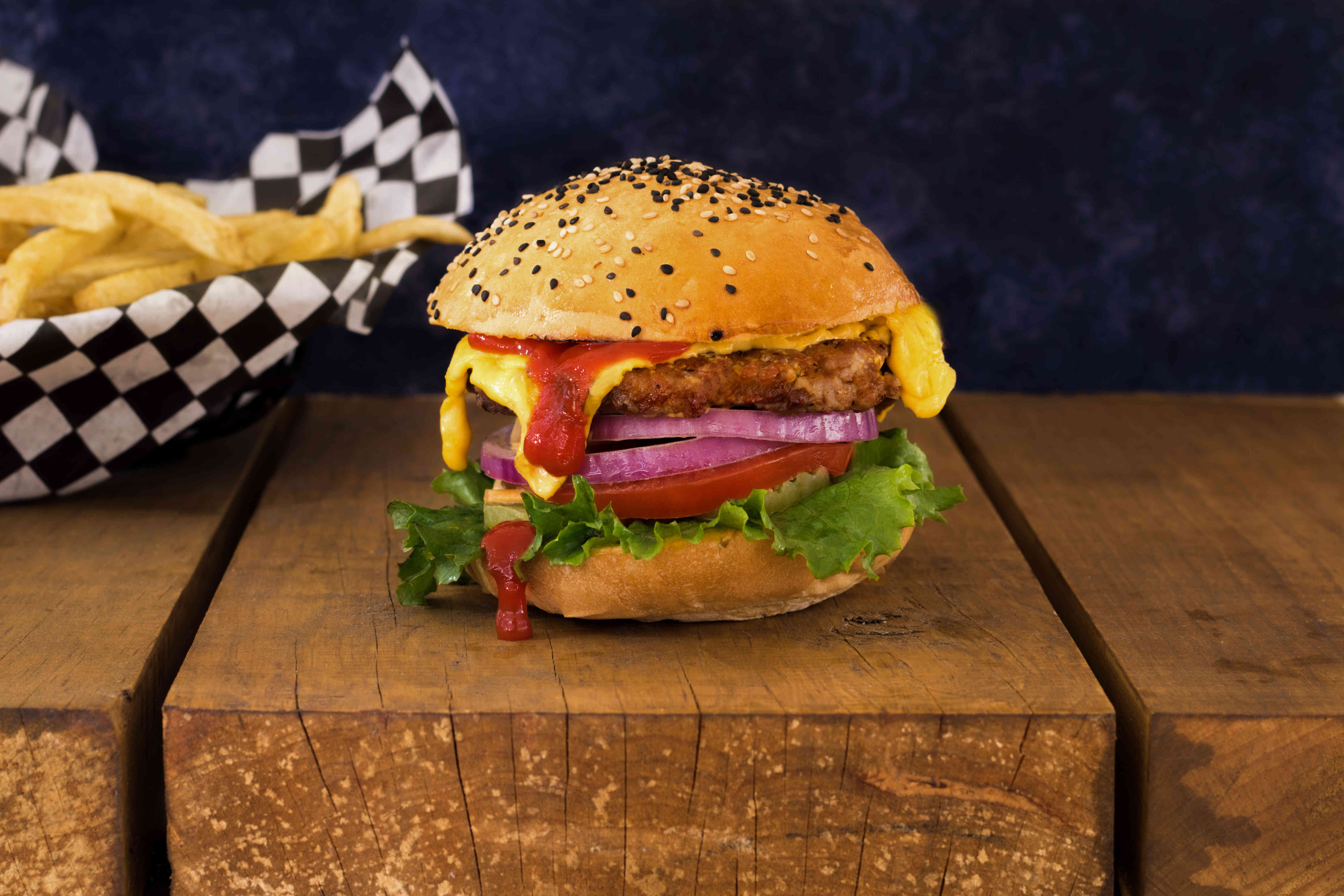 Hamburguesa tradicional de pan artesanal y carne casera acompañada con lechuga, jitomate, queso menonita y americano, anillos de cebolla, pepinillos y aderezo especial de la casa con una porción de papas a la francesa