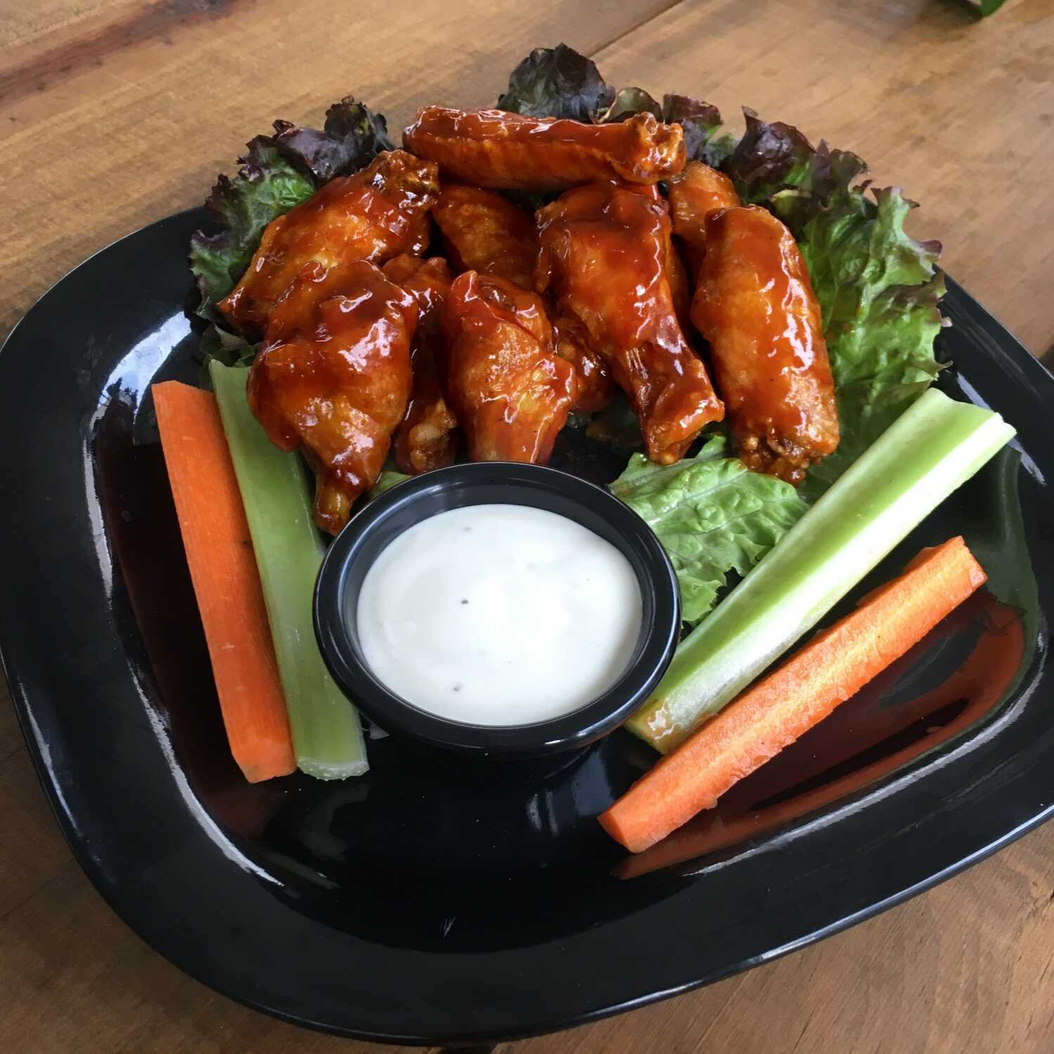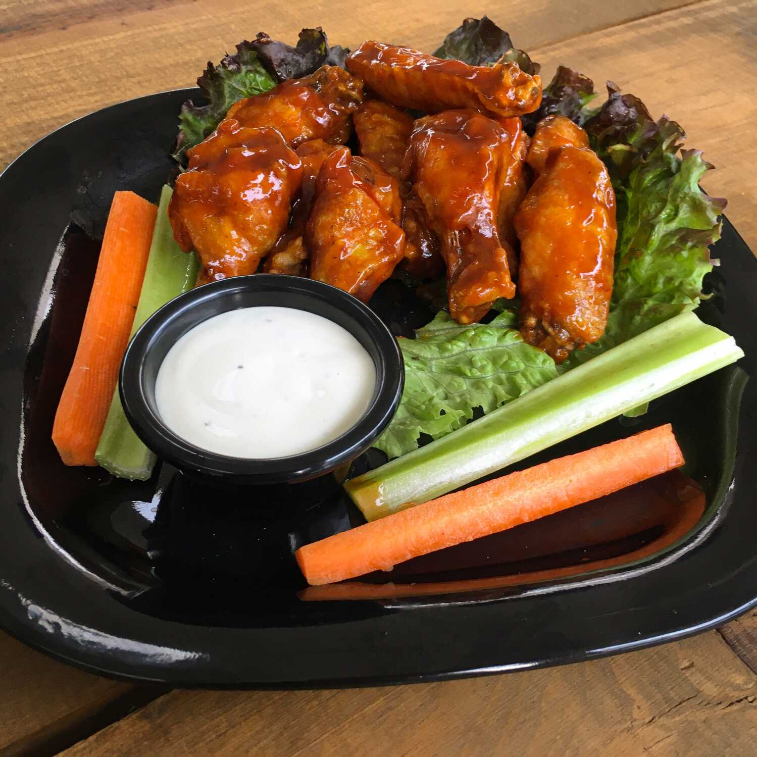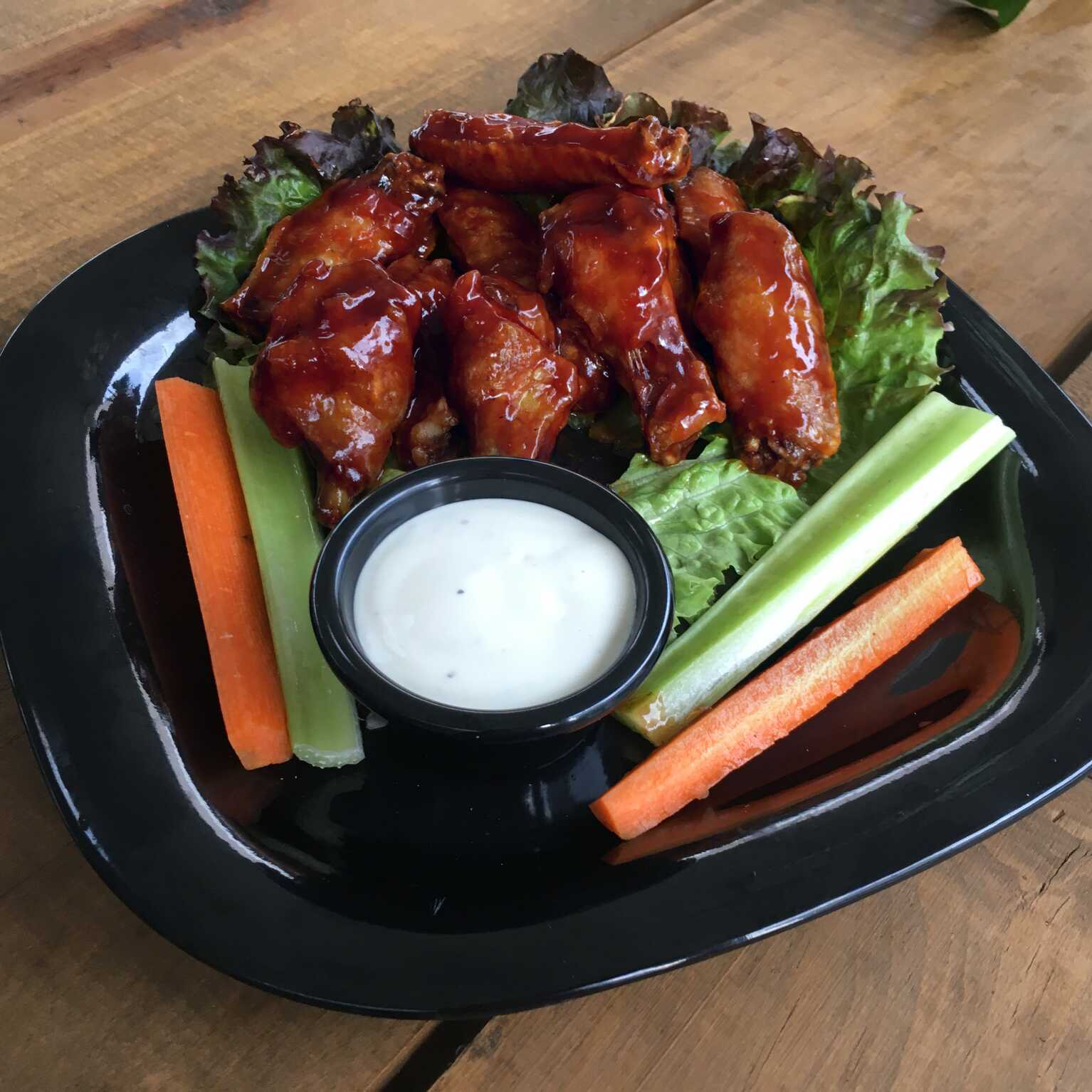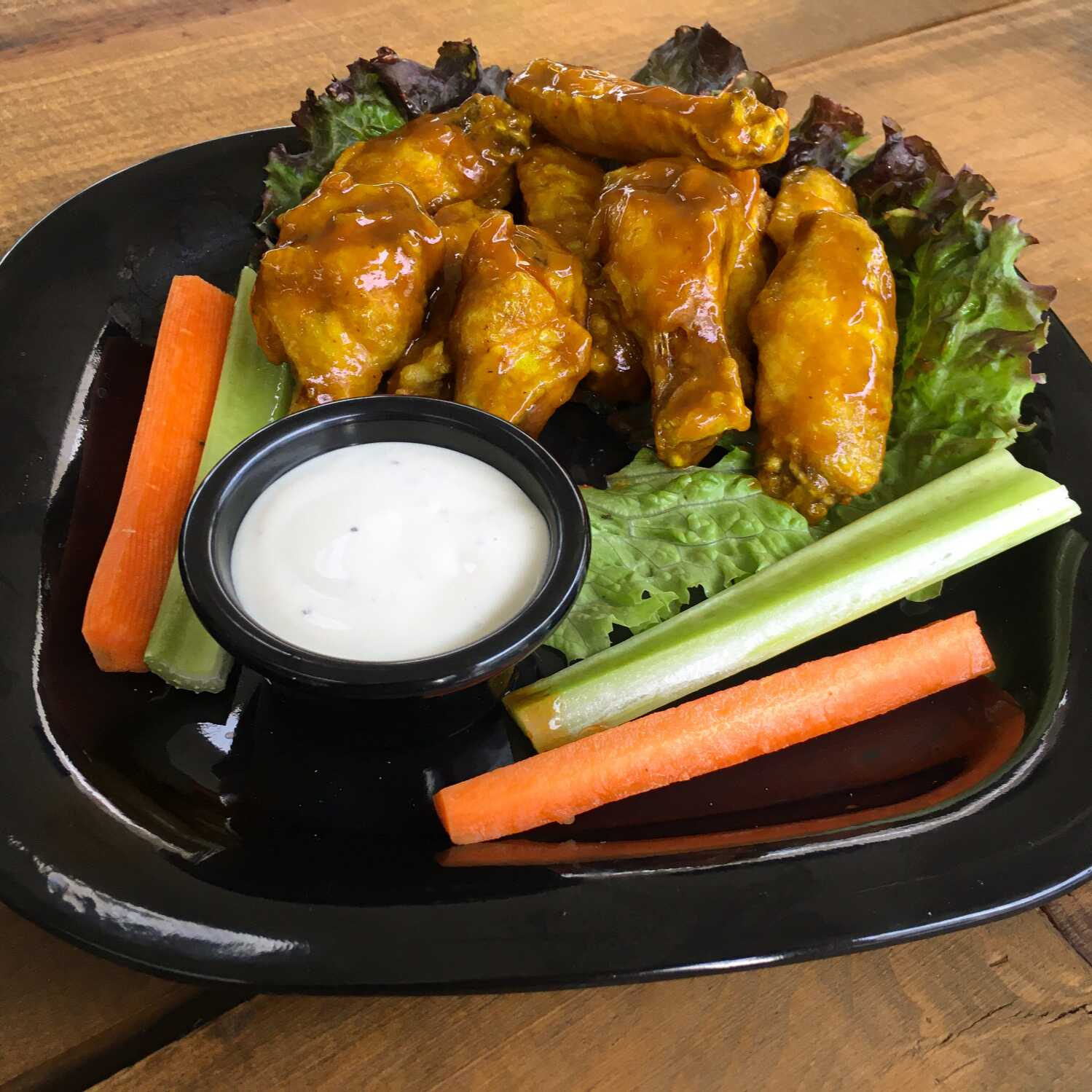 Orden de 8 piezas de alitas de pollo acompañadas de tiras de apio, zanahoria y aderezo ranch.
