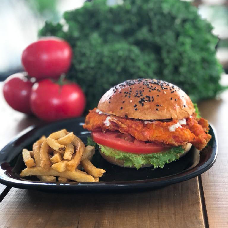 Hamburguesa de pan artesanal con pechuga de pollo empanizada y bañada en salsa Buffalo, anillos de cebolla, rebanadas de jitomate y aderezo ranch con una porción de papas a la francesa