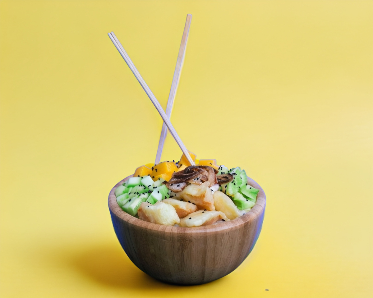 Base: Yakimeshi Proteina: Pollo Teriyaki Toppings: Mango, Brocoli, Jitomate cherry y Queso Philadelphia Crunch: Chips de betabel Aderezo: Tamarindo Spicy