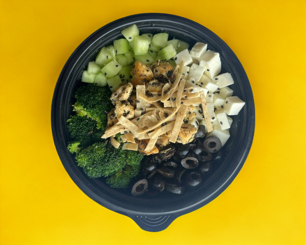 Base: Gohan, Proteina: Pollo Finas Hierbas, Toppings: Brocoli, Pepino, Panela, Aceituna negra, Crunch: Chips de tortilla, Aderezo: Ponzu