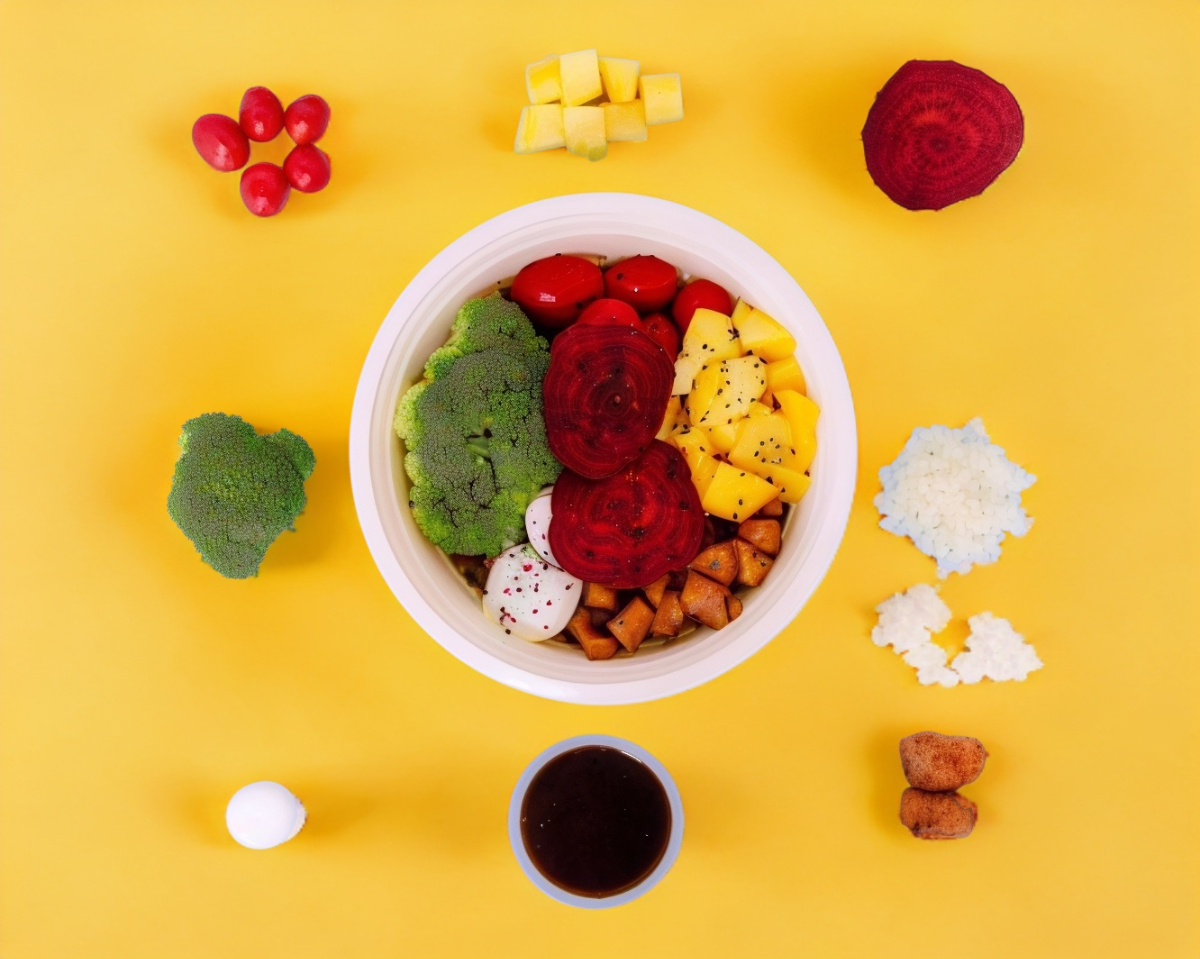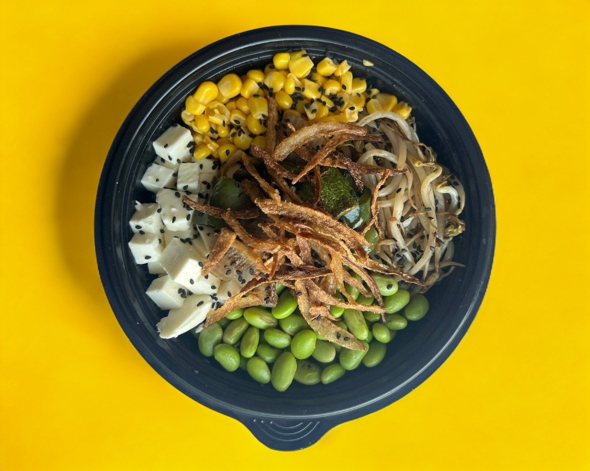 Base: Arroz de Coliflor, Proteina: Verduras Teppan, Toppings: Edamames, Germen de soya, Granos de elote, Panela, Crunch: Cebolla frita, Aderezo: Ponzu