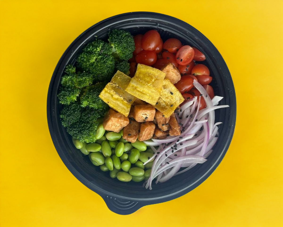 Base: Yakimeshi de Coliflor, Proteina: Tofu crujiente, Toppings: Edamames, brocoli, cebolla morada, jitomate cherry, Crunch: Chips de platano, Aderezo: Teriyaki