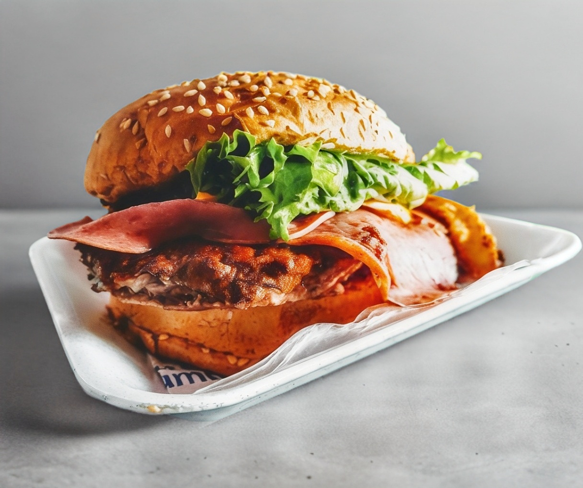 Arrachera Burger Sencilla Producto con Carne 100% de Arrachera, Jamón de pavo, Queso suizo, Verdura, Servida con media orden de papas y 1 Chilito relleno de Quesos con Tocino.