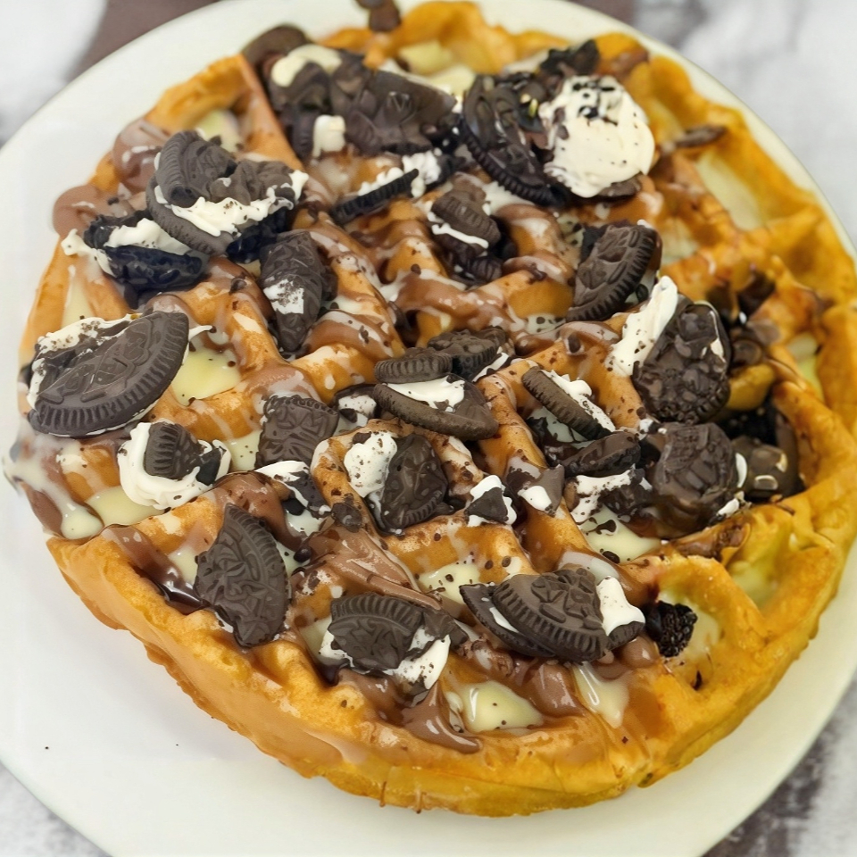Waffle casero estilo belga, hecho al momento; acompáñalo con tus ingredientes preferidos y un topping de fruta.