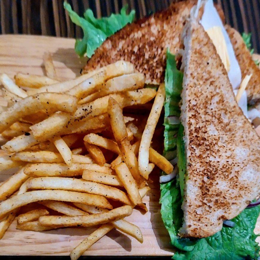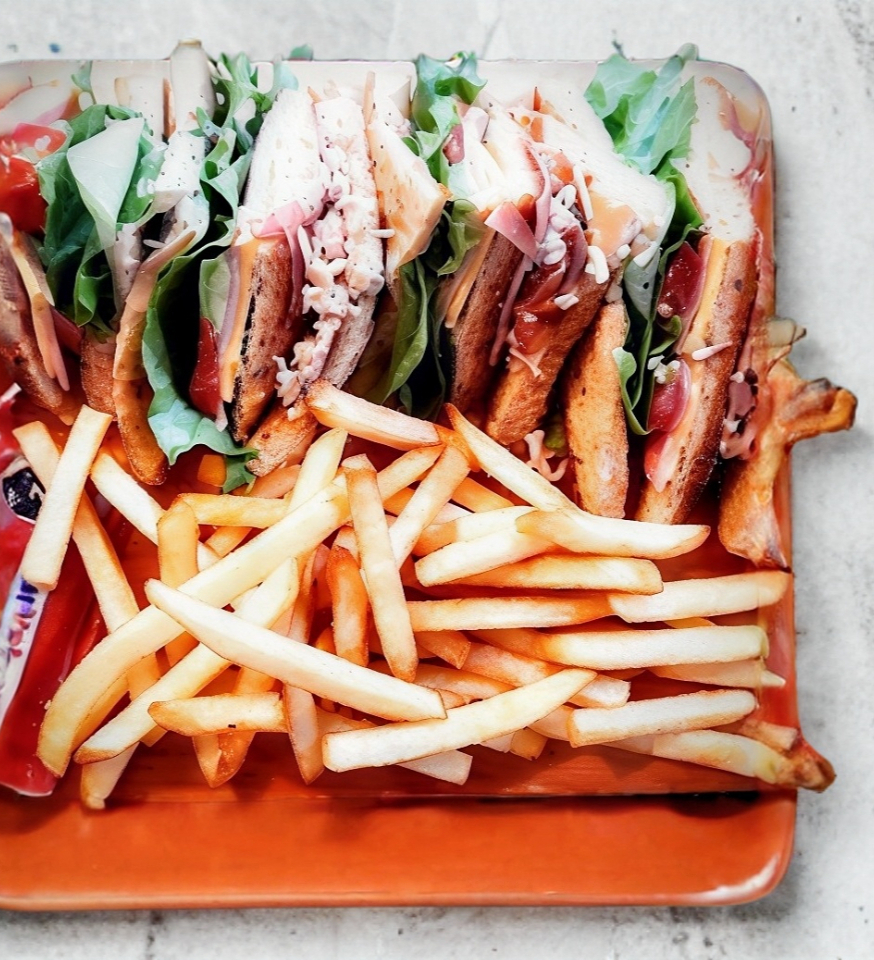 3 Piezas de pan oroweat, jamón, queso, pollo, tocino, lechuga, jitomate y aguacate; acompañado de papas a la francesa.
