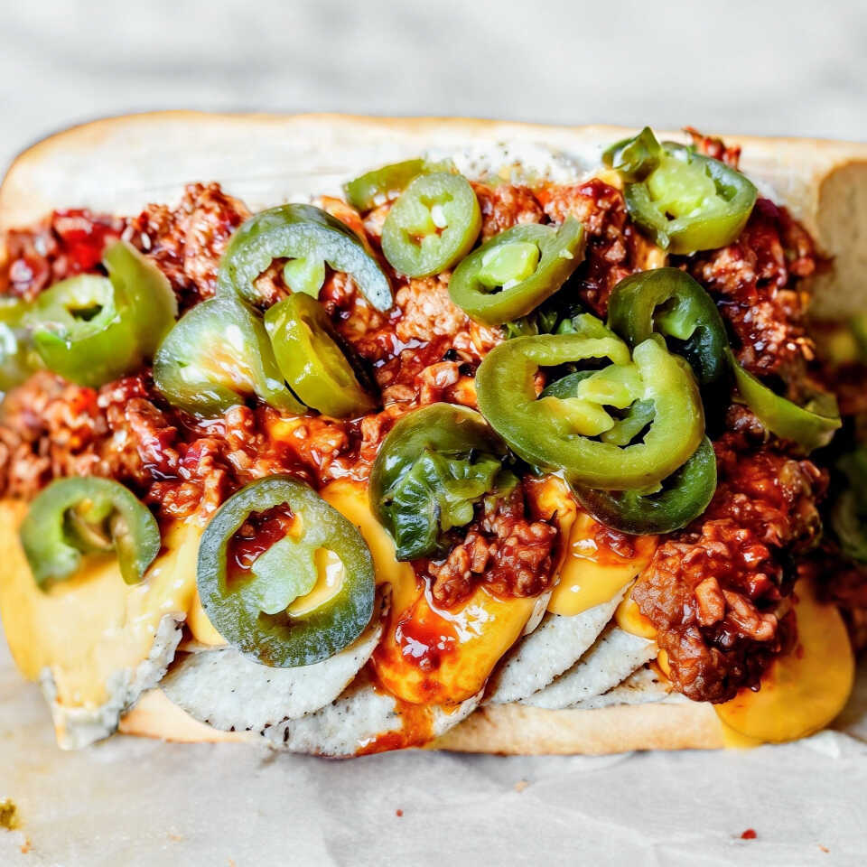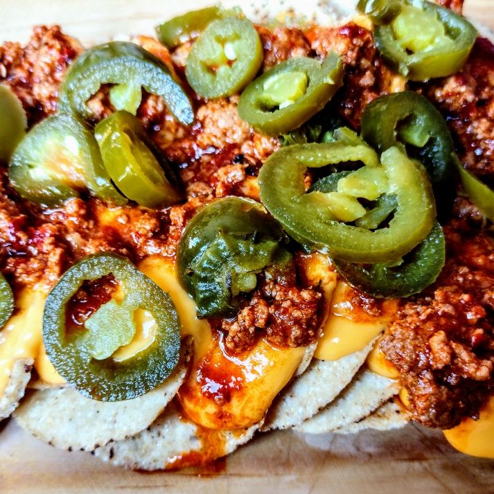 Nachos bañados con queso derretido, delicioso chili y chiles en vinagre.