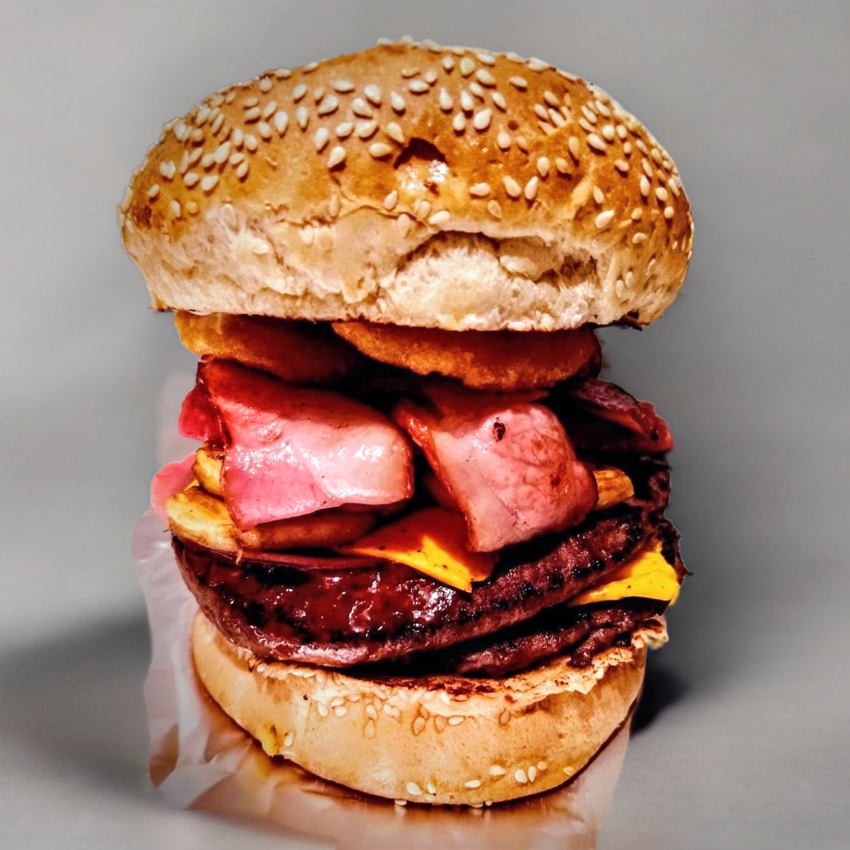 Doble carne de arrachera, doble queso, doble jamón, salchicha, tocino y aros de cebolla; acompañada de papas.