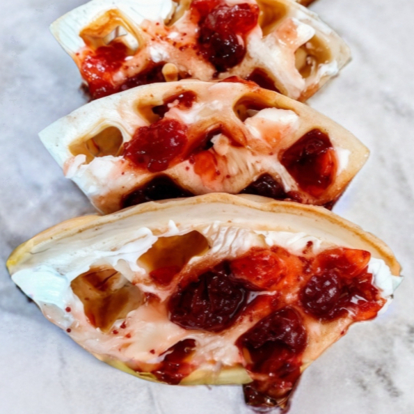 Queso fundido con jamón, piña asada, salchicha, lechuga, jitomate y aguacate.