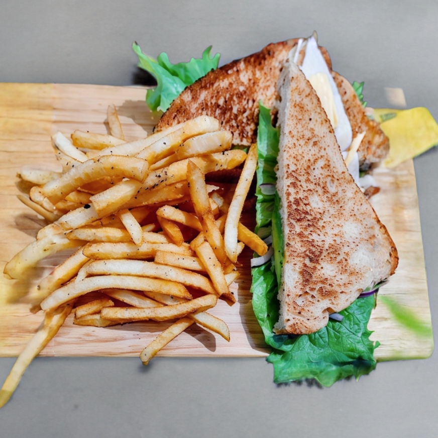 2 Panes oroweat planchados, jamón, queso, lechuga, jitomate y aguacate; servido con papas a la francesa.