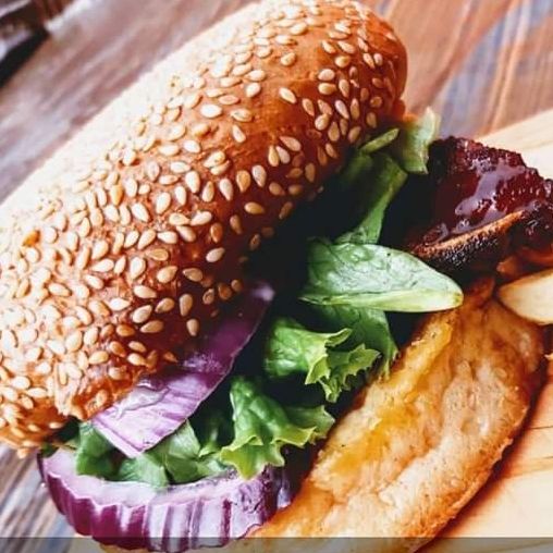 Hamburguesa de costillas a la bbq, con tocino, queso mozzarella, aros de cebolla, lechuga y jitomate. Incluye guarnición de papas.