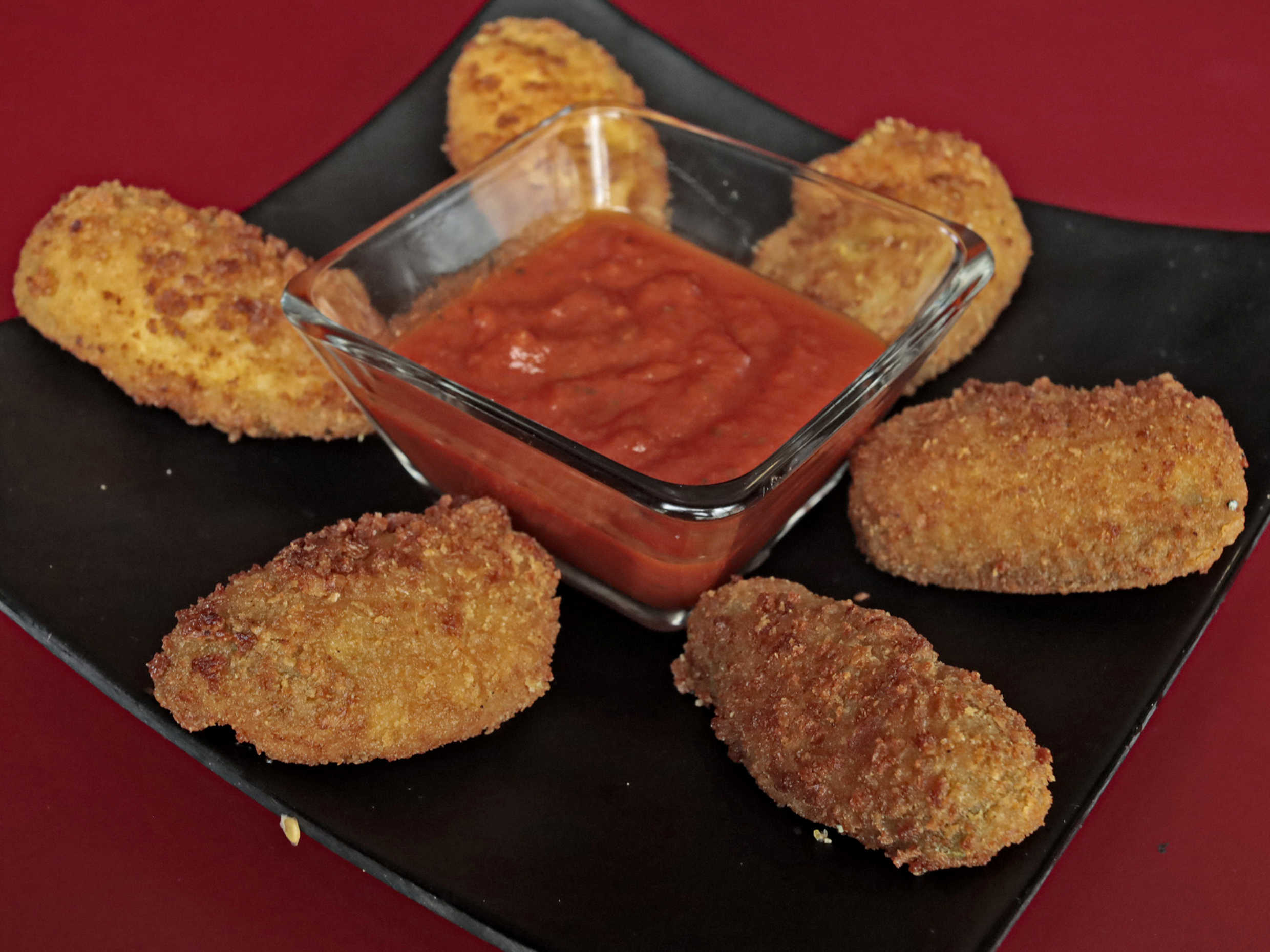 6 piezas (185 gramos) de queso mozzarella empanizadas, condimentadas, fritas, acompañadas de salsa marinara.