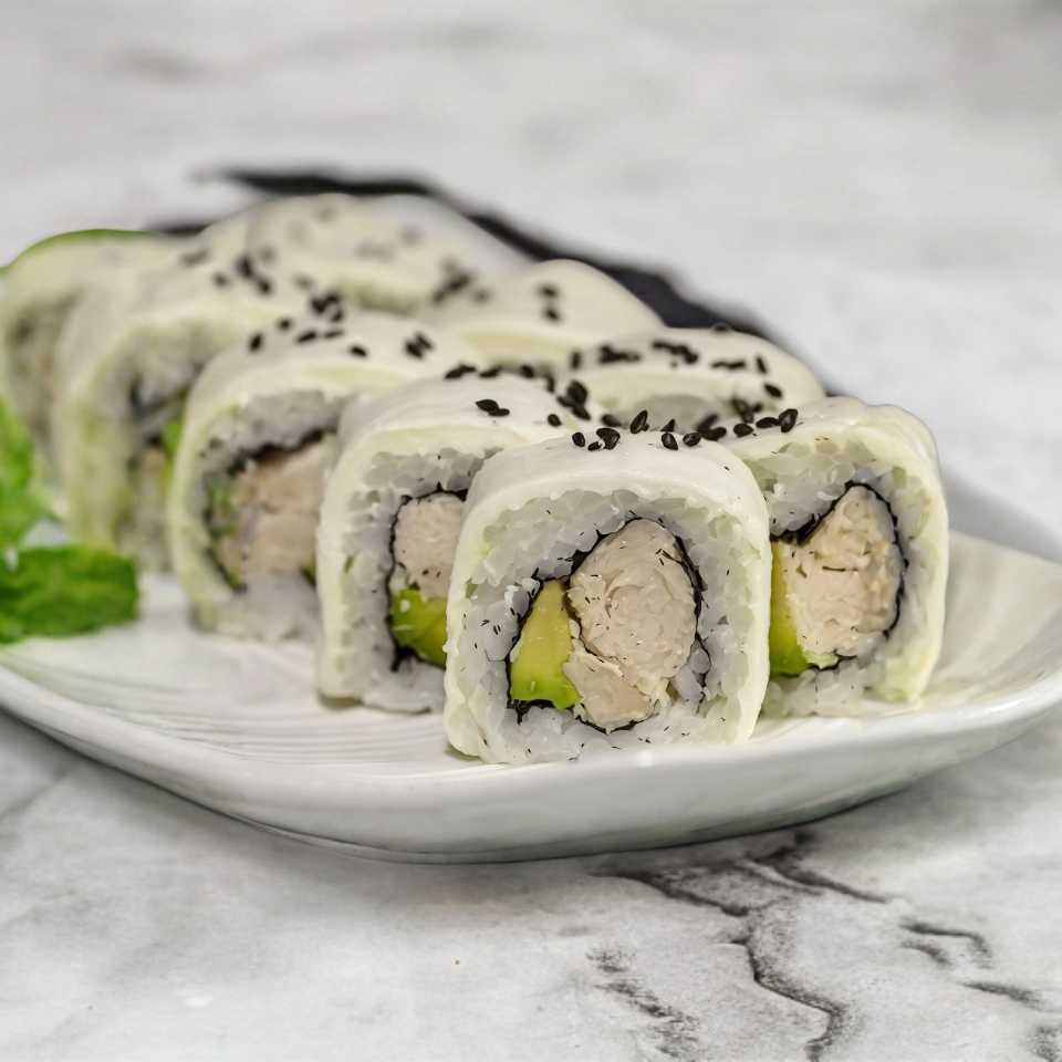 Pepino, queso philadelphia, aguacate, aderezo chipotle y cangrejo empanizado.