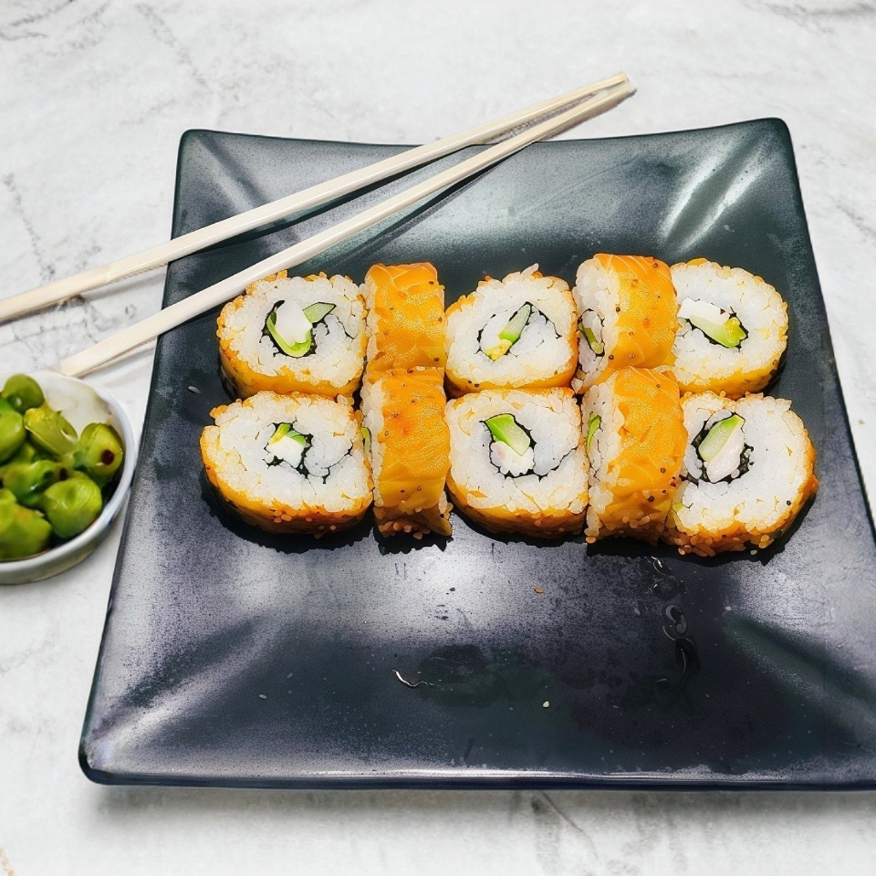 Roll empanizado relleno de surimi, pepino, aguacate y queso Philadelphia. 👉 Platillo personal de 10 piezas.