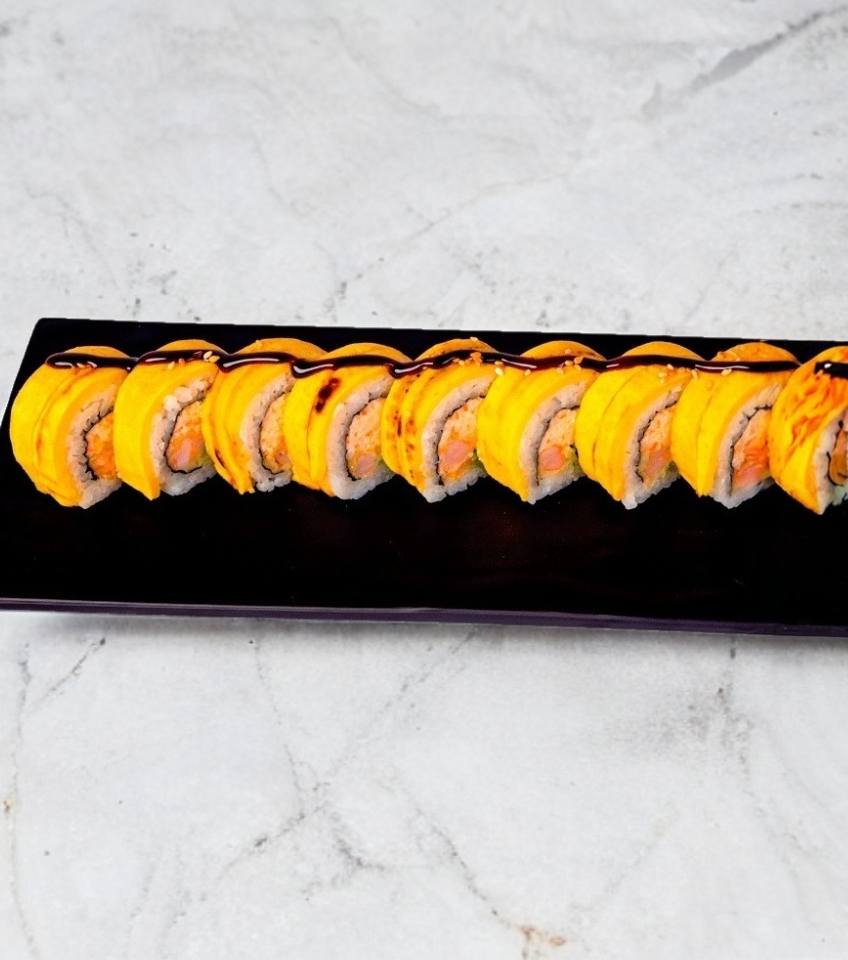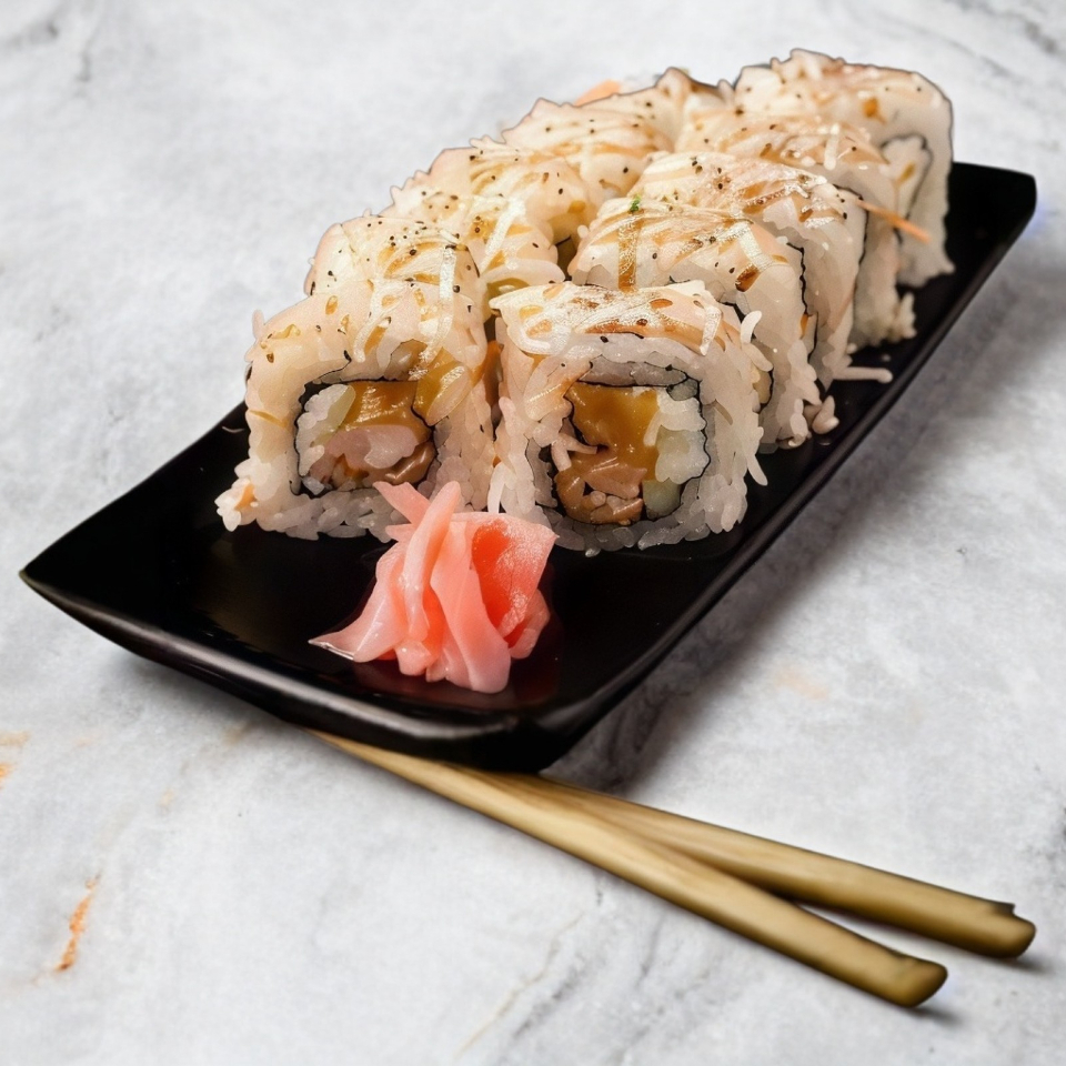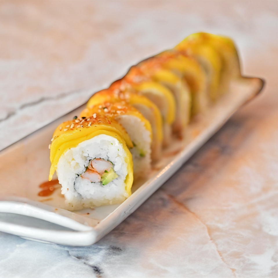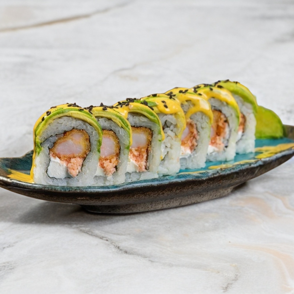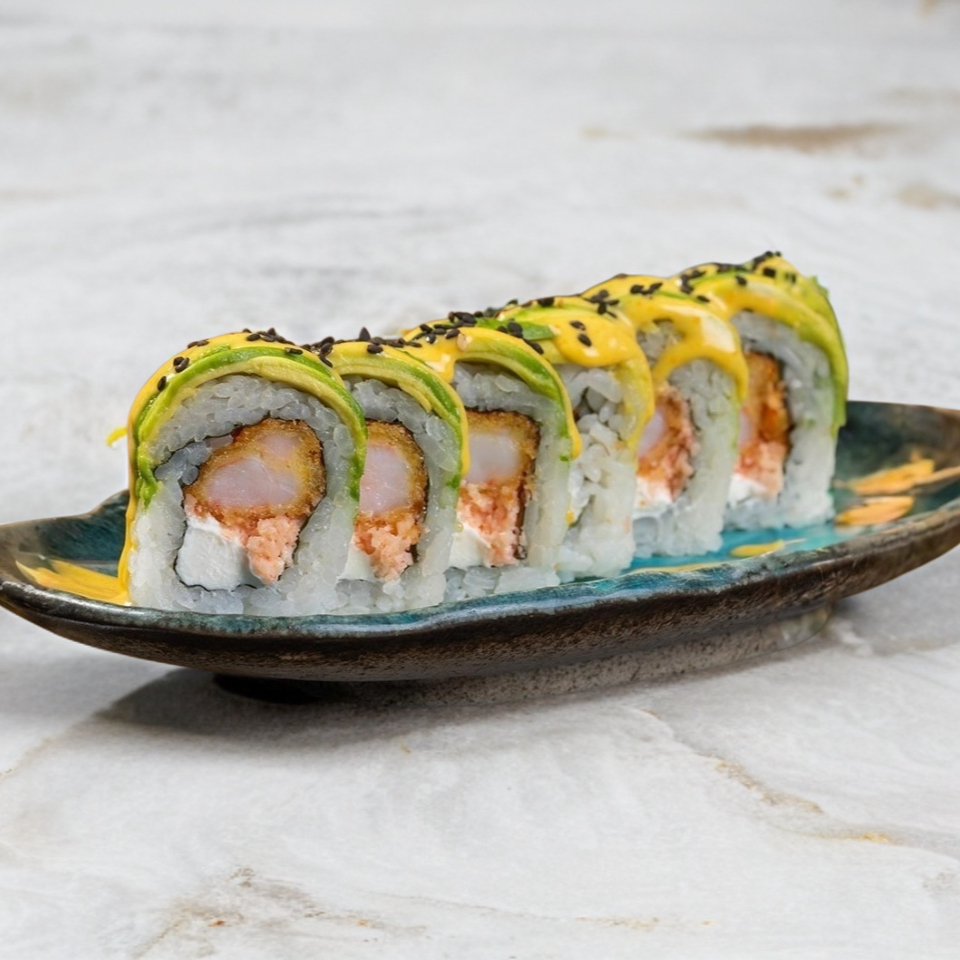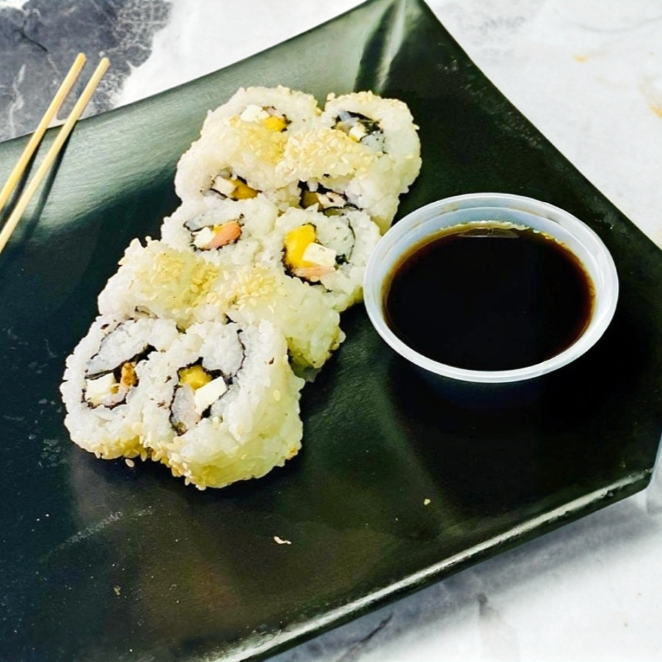 Porcion personal: 10 Bocados de sushi Panamá roll con relleno de plátano macho, salsa dulce, camarón, queso philadelphia y aguacate.