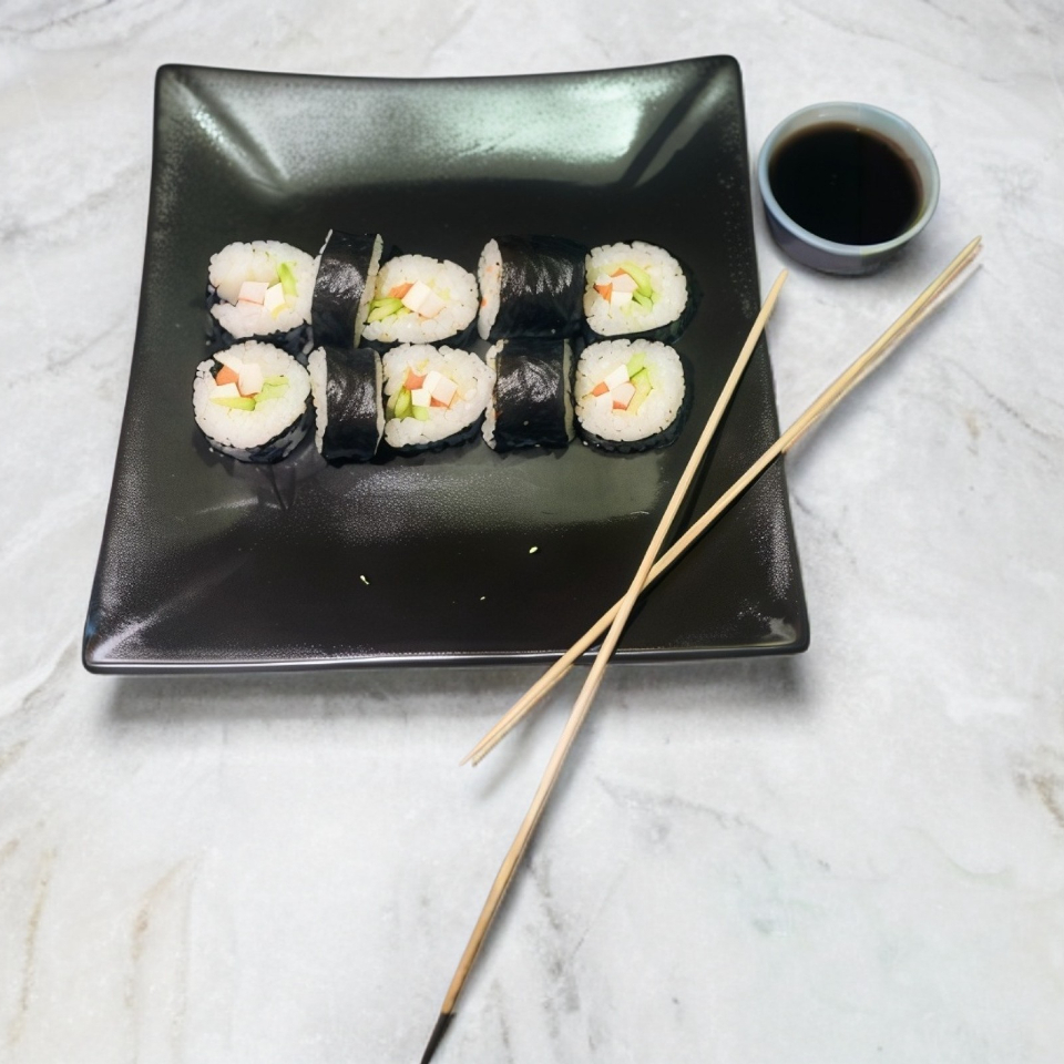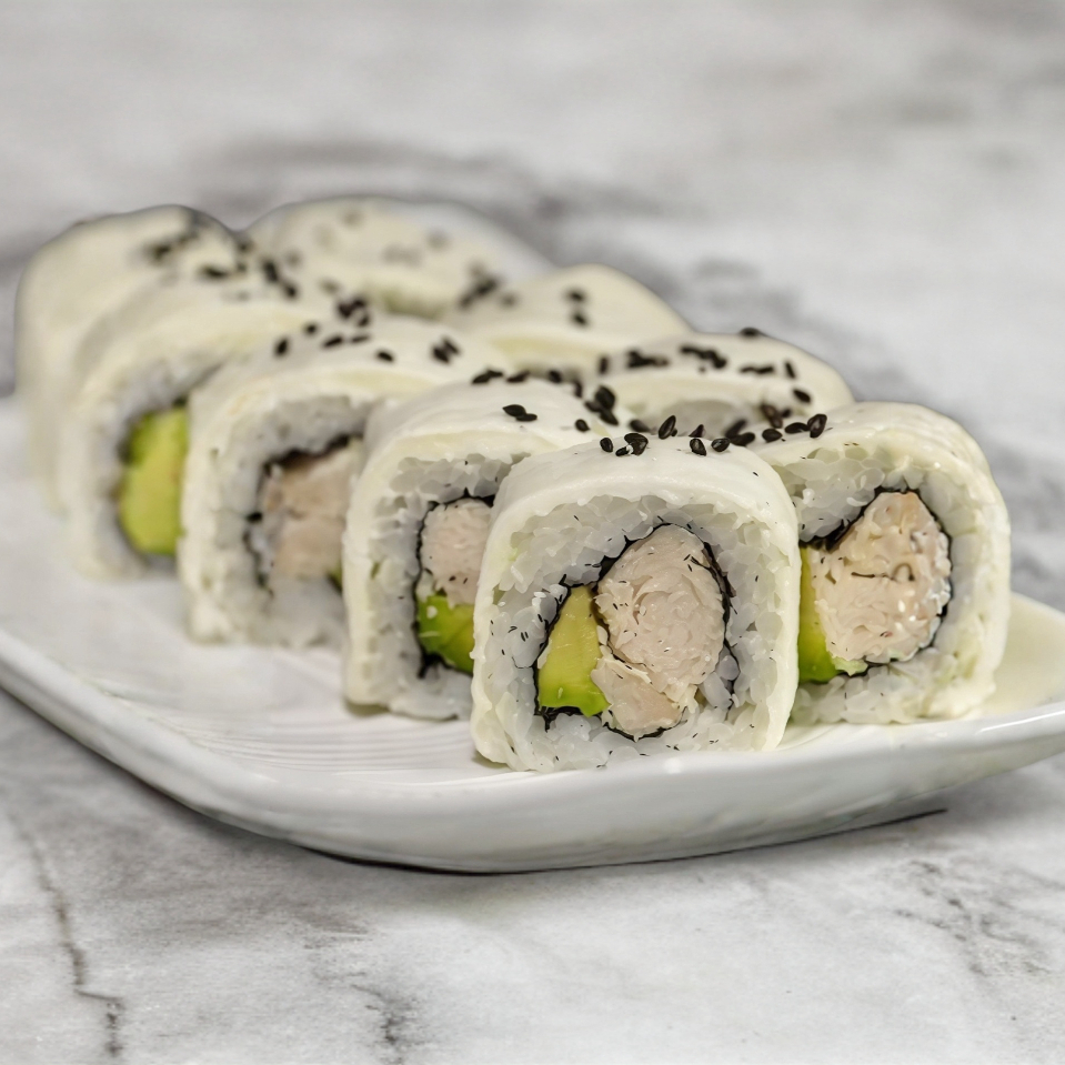 Porcion personal: Sushi Roll de Cangrejo Empanizado (10 bocados) Roll de sushi relleno con pepino, aguacate y queso Philadelphia, acompañado de cangrejo empanizado y un toque de aderezo chipotle.