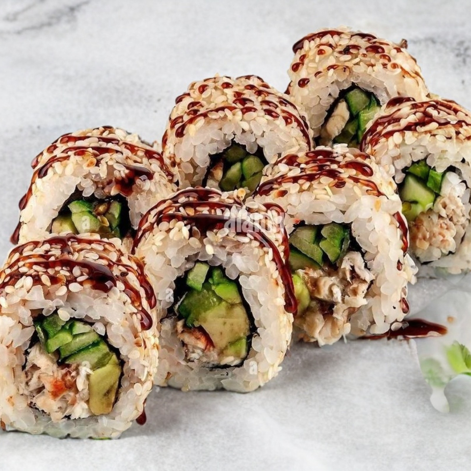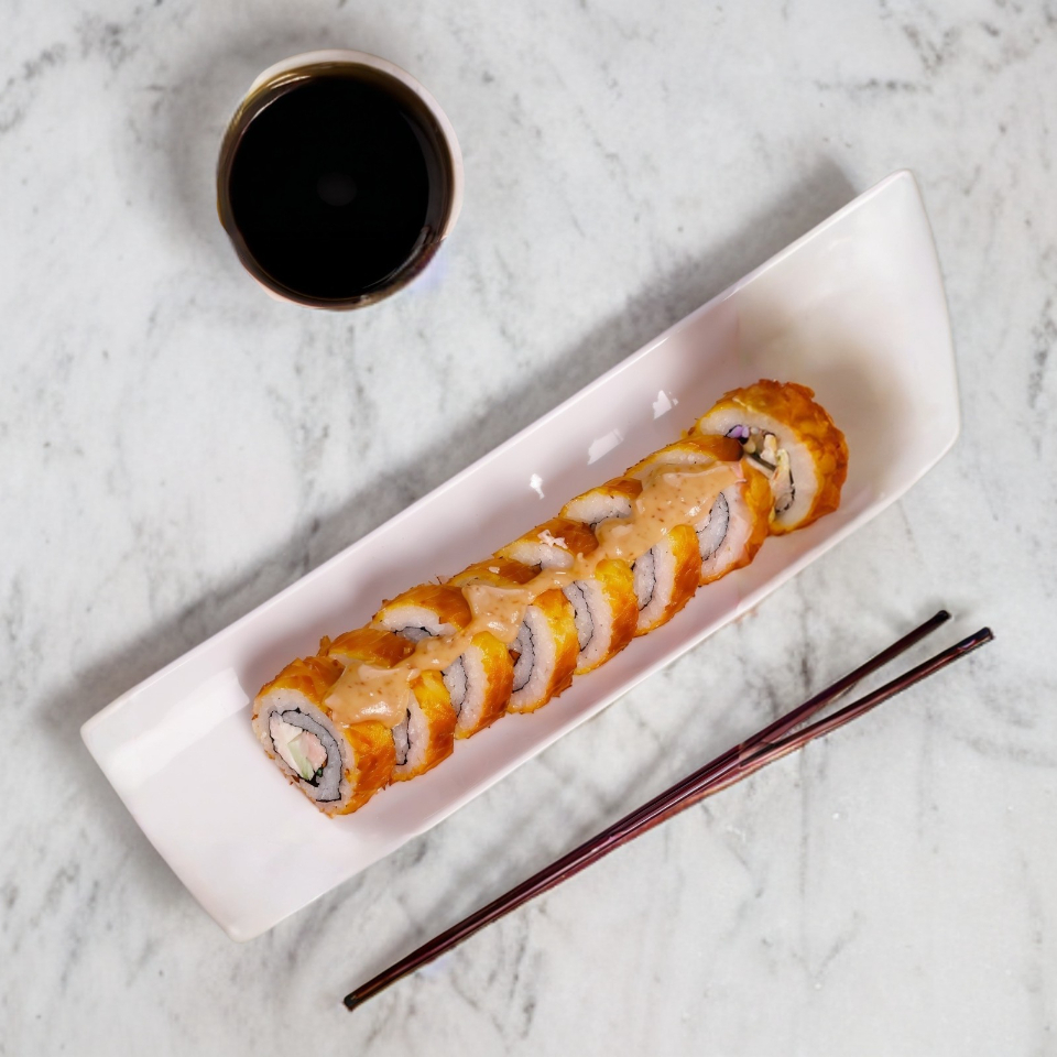 Roll empanizado por fuera y cubierto con salsa de tamarindo, relleno de cangrejo, queso Philadelphia y pepino. 👉 Platillo personal de 10 piezas.
