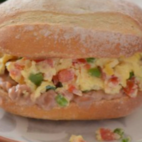 Torta de huevo con chorizo con frijoles refritos, mayonesa, lechuga, aguacate, jitomate y cebolla.