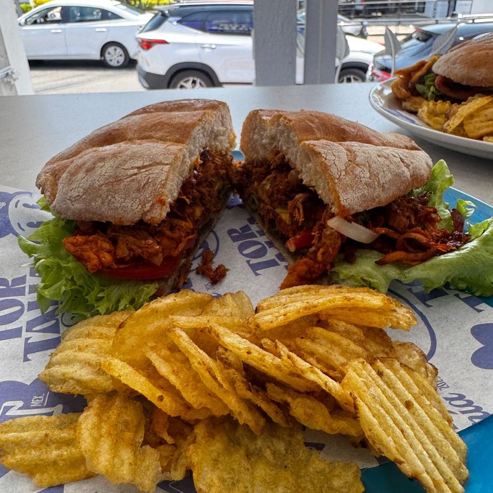 Torta de pierna adobada con frijoles refritos, mayonesa, lechuga, aguacate, jitomate y cebolla.