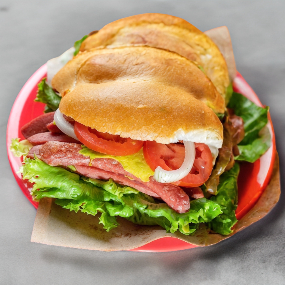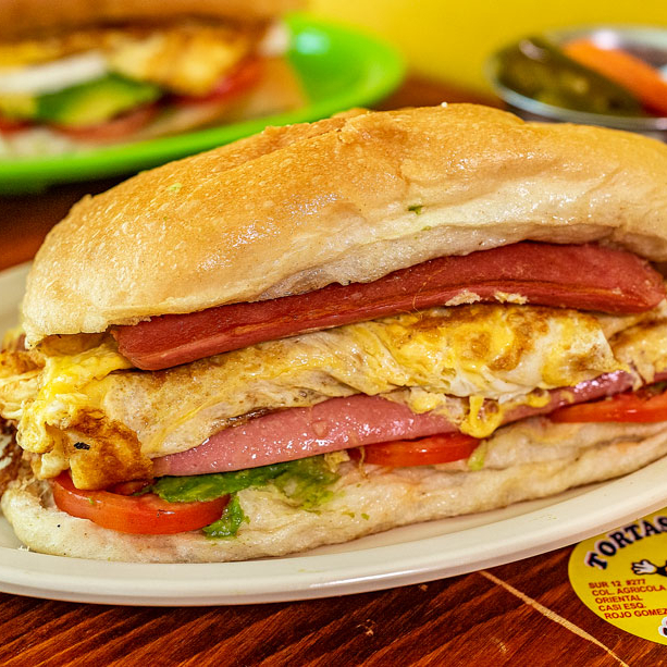 TELERA GIGANTE CON MAYONEZA JAMON QUEXO MANCHEGO LECHUGA JITOMATE CEBOLLA CHILES EN ESCABECHE