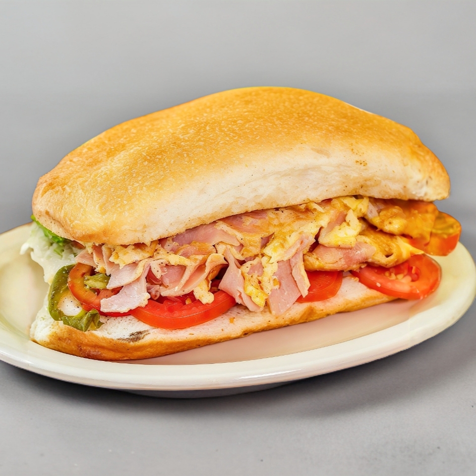 TELERA GRANDE CON HUEVO Y JAMON CON LECHUGA JITOMATE CEBOLLA MAYONESA Y CHILES EN VINAGRE