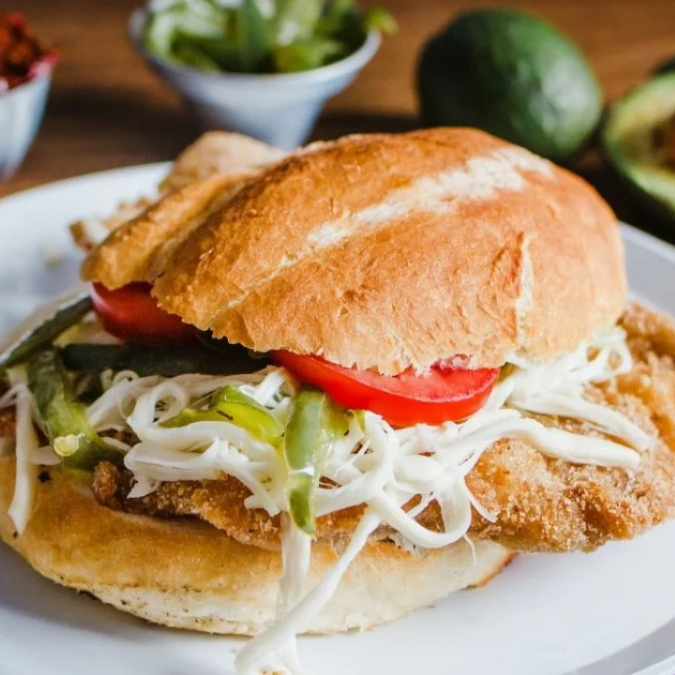 TELERA GRANDE CON FRIJOLES MILANESA EMPANIZADA DE FRIJOL GITOMATE LECHUGA CHILES EN VINAGRE JITOMATE Y QUESO MANCHEGO
