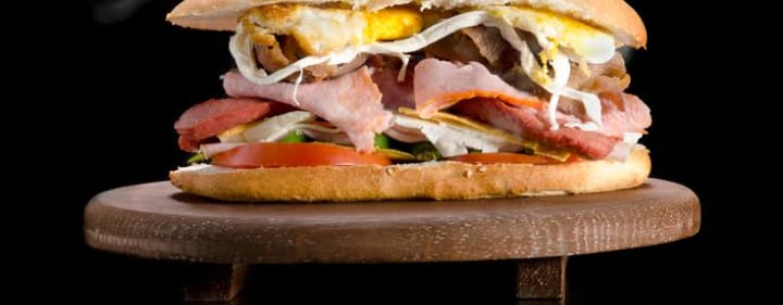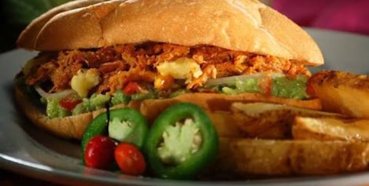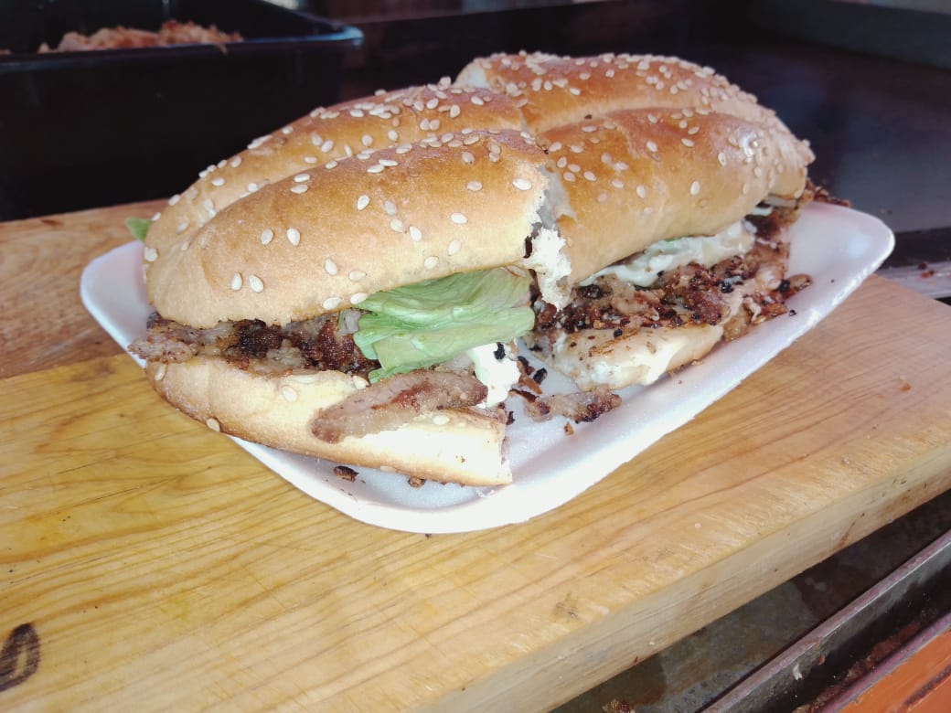 Milanesa, salchicha, jamón, jitomate, cebolla, lechuga, aguacate y mayonesa.