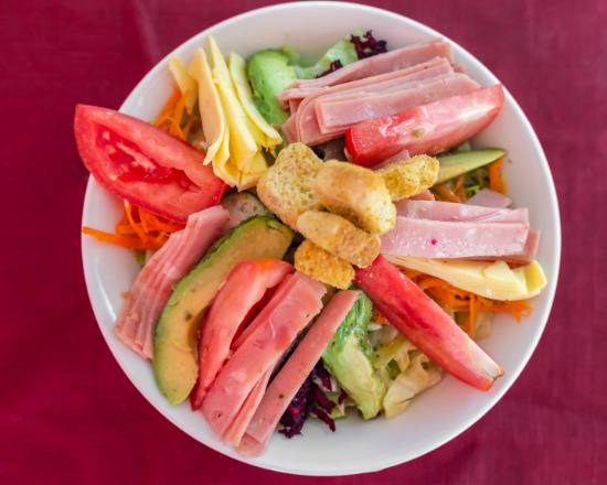 Cama de lechuga romana con jitomate, aguacate, croutons, zanahoria, betabel rallado con queso, pollo y jamón