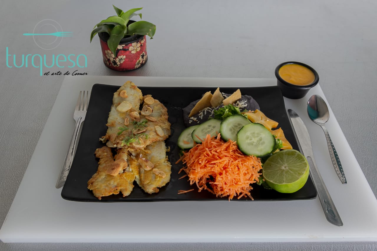 Filete de pescado (empanizado, a la talla o al mojo de ajo ) acompañado con ensalada fresca y frijoles refritos.