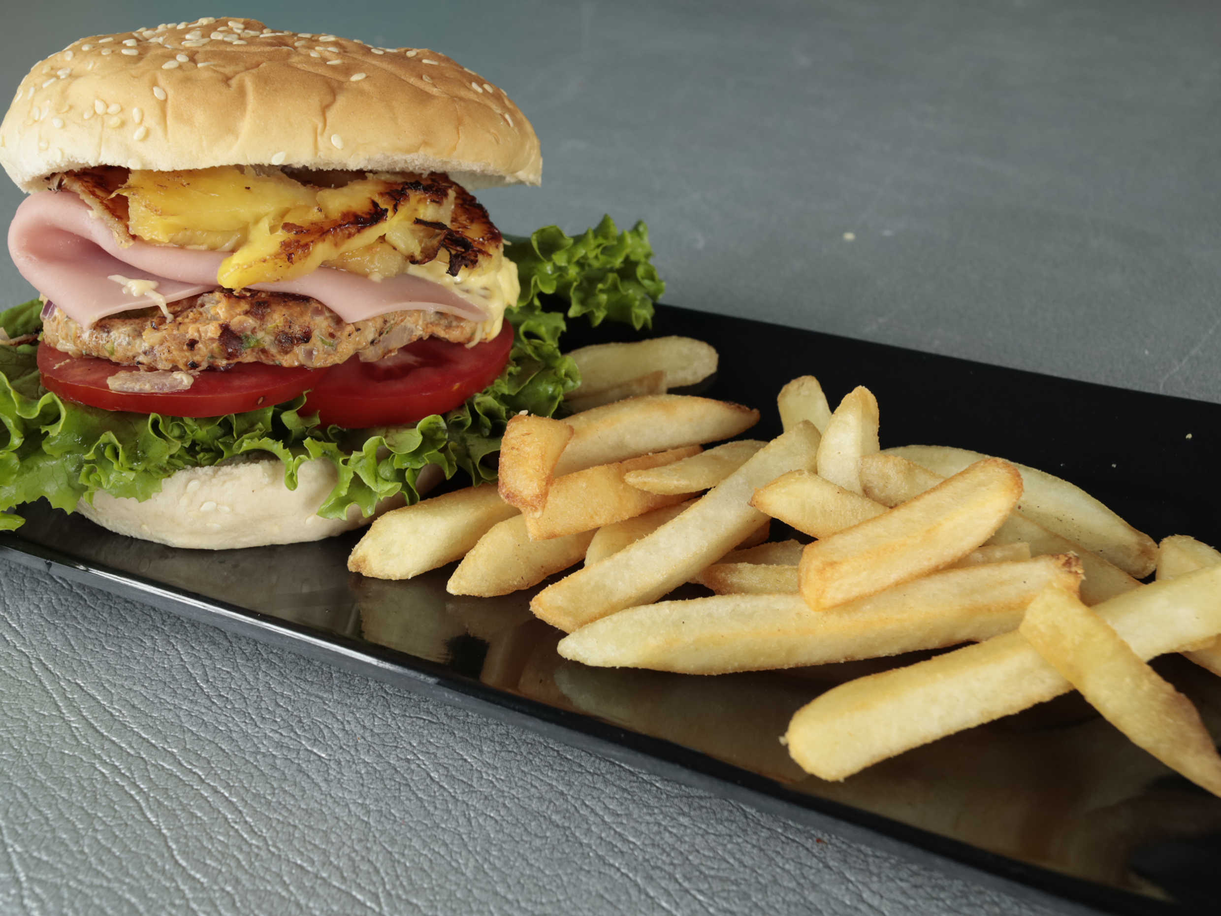 Hamburguesa con jugosa carne de res a la plancha, queso manchego, piña asada y jamón, con un toque de aderezo chipotle.