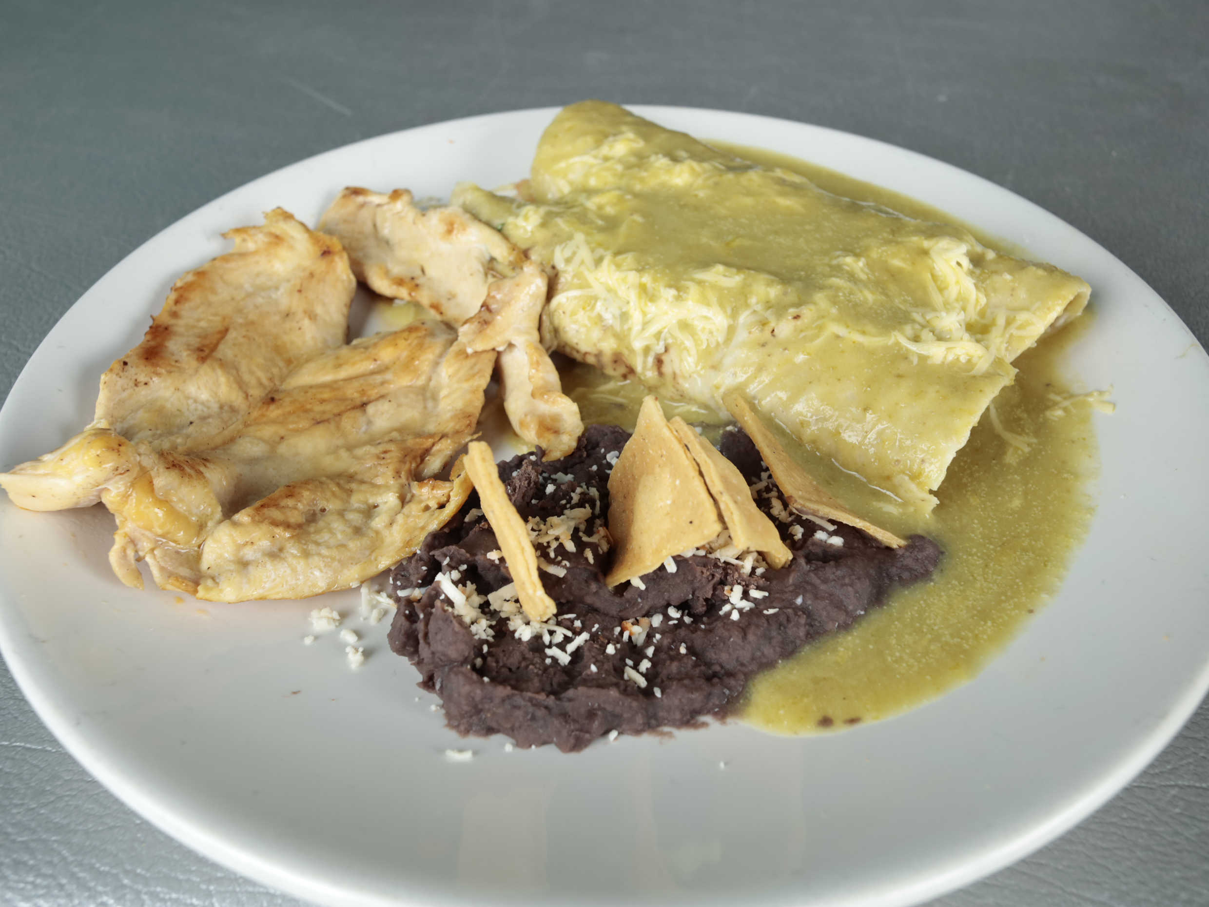 Dos enchiladas relenas de pollo, bañadas en salsa suiza y queso manchego, acompañadas de pechuga asada y frijoles refritos.