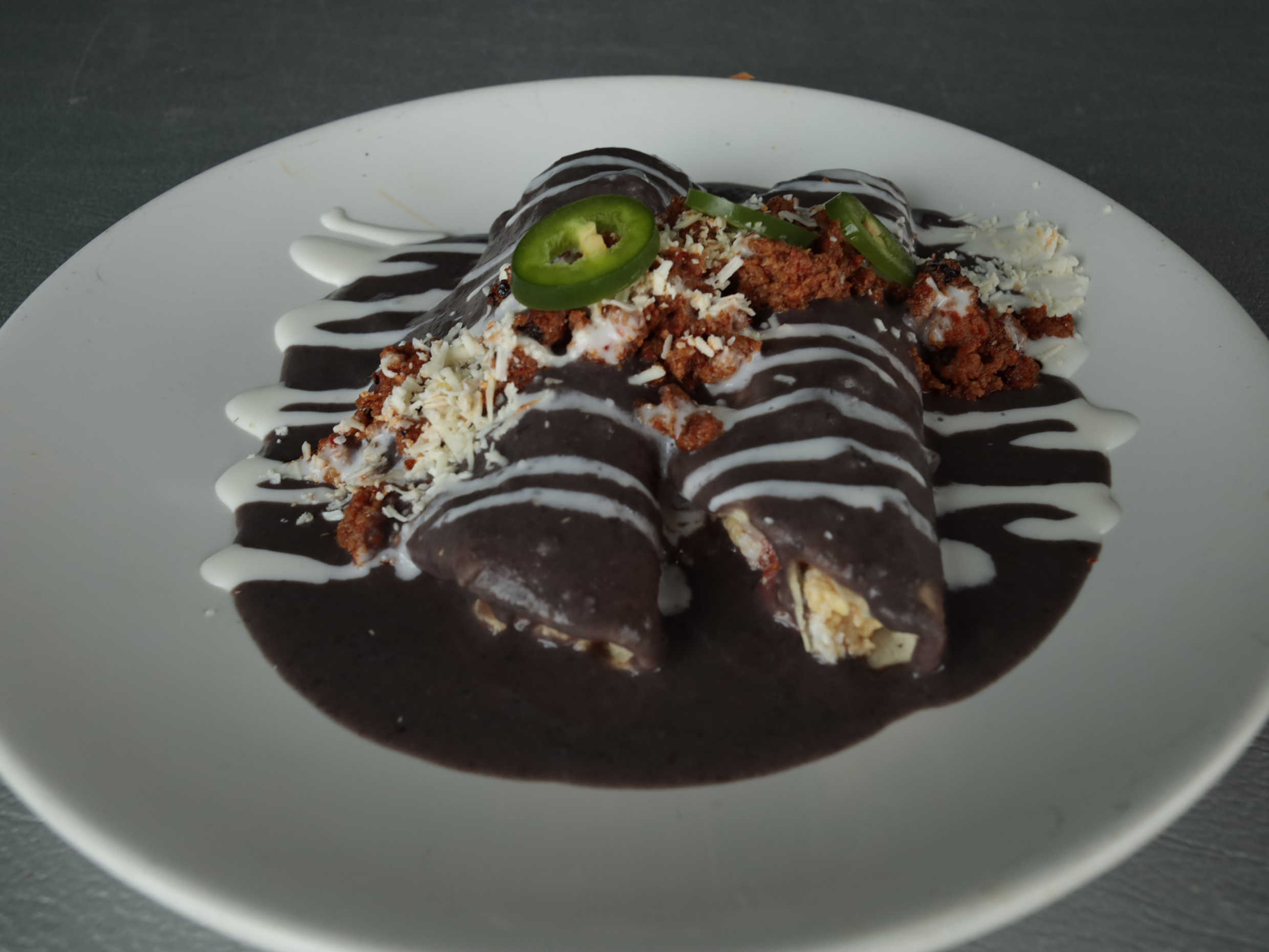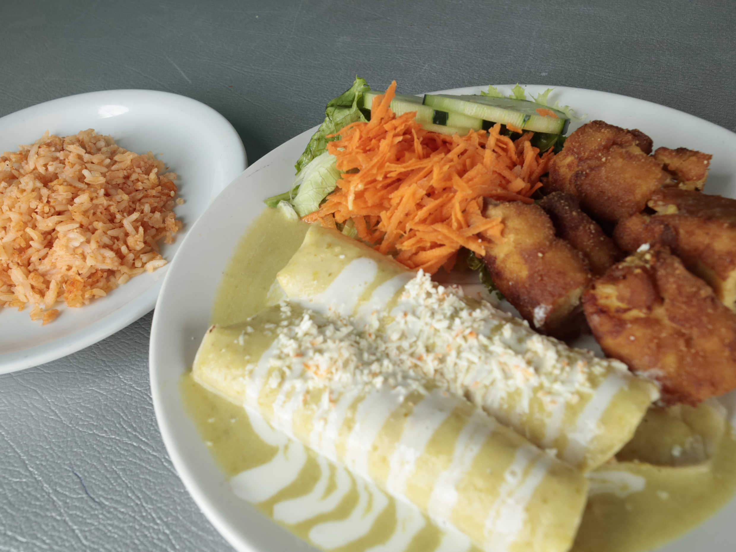 Tres enchiladas rellenas de pollo y bañadas con salsa suiza y queso manchego.